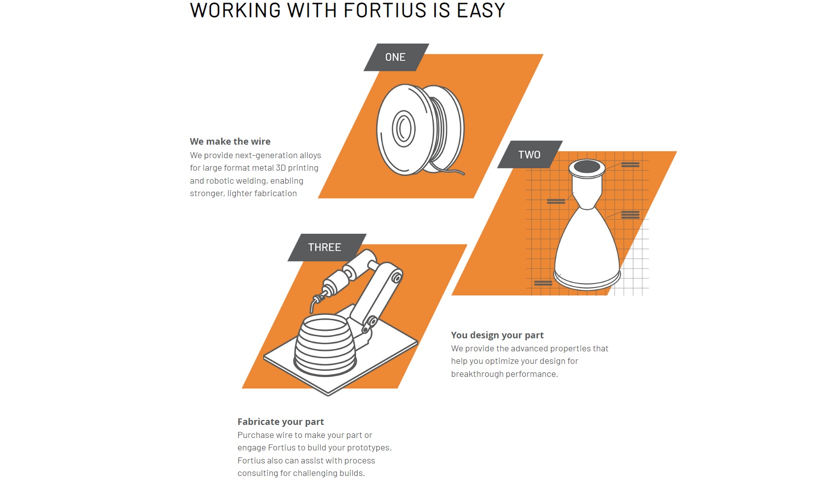 Das 3D-Druck-Unternehmen Fortius Metals konzentriert sich auf fortschrittliche Materialien für den Großformat-3D-Druck. Es unterstützt Kunden bei der Entwicklung von Lösungen, die mit robotergestütztem 3D-Druck nicht möglich wären. Die Technologie von Fortius Metals ermöglicht das Schweißen und die Herstellung von 3D-Drähten unter der Verwendung von Hochleistungsmetalllegierungen. Damit erfüllt es die hohen Anforderungen von Kunden aus der Luft– und Raumfahrt und der Herstellung von Schweißrobotern.