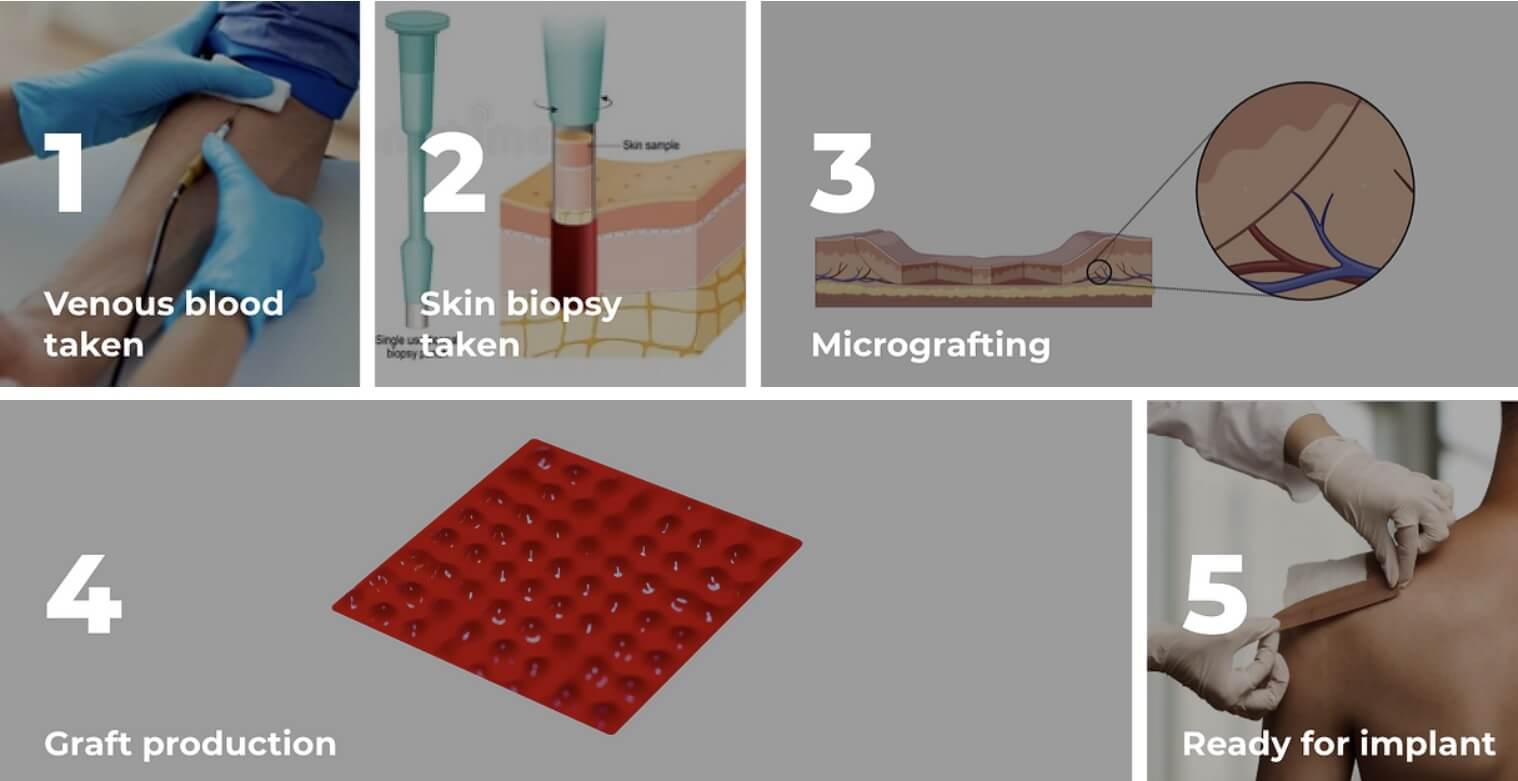 Das zwischen 200 und 400 Mikrometer oder 0,2 bis 0,4 Millimeter dünne Mikrotransplantat ist ein lebendes Stück Hautgewebe. Es ist mit einem vorvaskularisiertem System ausgestattet, das lokal umgebende Gewebe zur Regeneration bewegt. Die in den Transplantaten enthaltenen Zellen bevölkern die umgebende extrazelluläre Matrix. Sobald diese während der Transplantationszeit im Blutpfropfen eingekapselt sind, haben sie Zugang zu Nährstoffen, Blutplättchen und Proteinen, die die Wundheilung unterstützen.