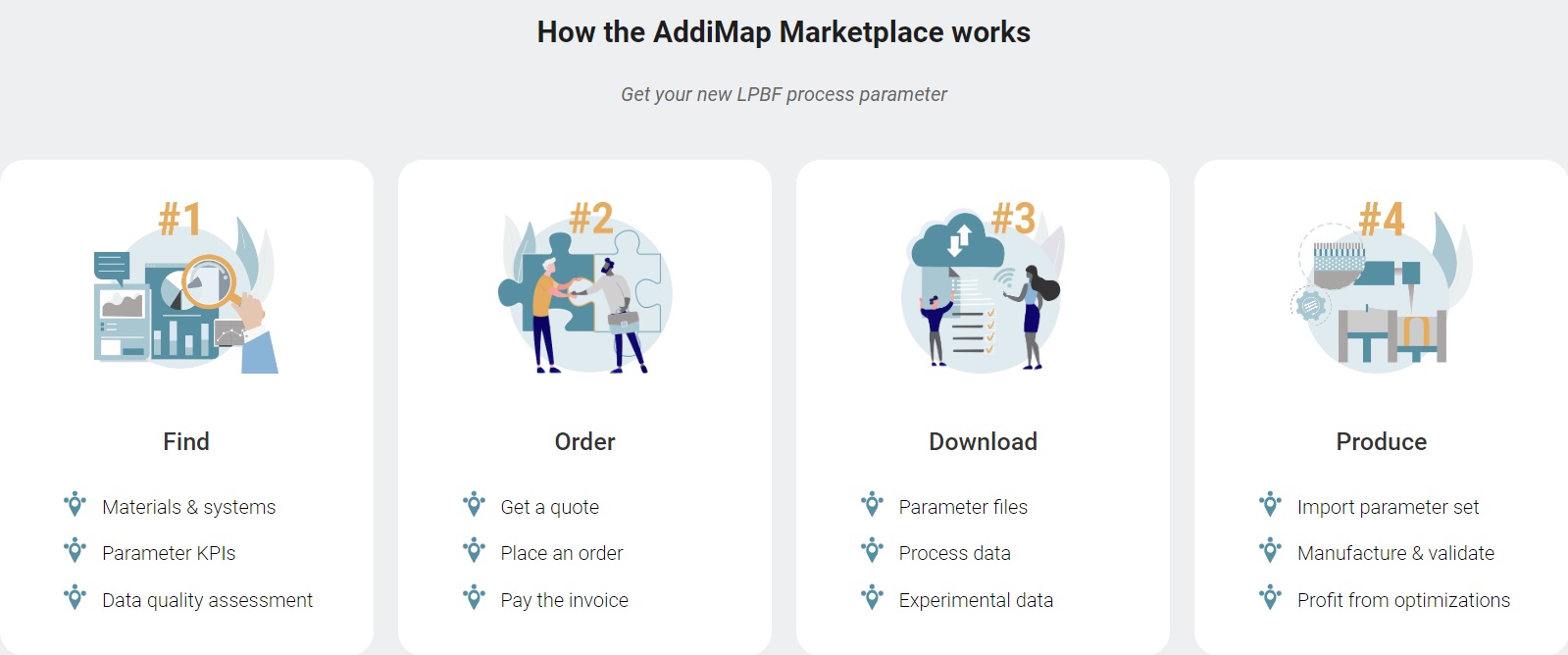 Der AddiMap-Marktplatz ist der „weltweit erste“ digitale Marktplatz für 3D-Druckprozessparameter (im Bild: die einzelnen Schritte, wie der Ablauf bei AddiMap funktioniert)(Bild © AddiMap).