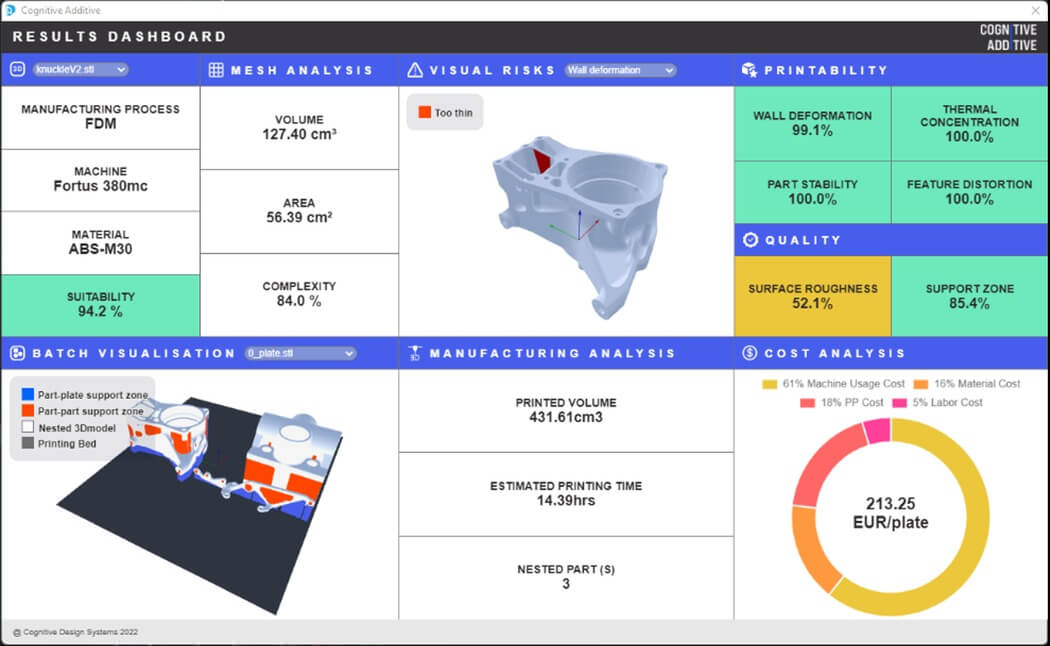 Das Design-Software- und Beratungsunternehmen CDS setzt auf künstliche Intelligenz für 3D-Modellierung und numerische Simulation. Benutzer können mit seiner Cognitive Additive-Software Teile ausrichten, verschachteln und Stützstrukturen erstellen. Gleichzeitig generiert die Software von CDS ein Dashboard-Ergebnis, das Kostenaufschlüsselung, Druckbarkeit und Maschineneignung enthält.