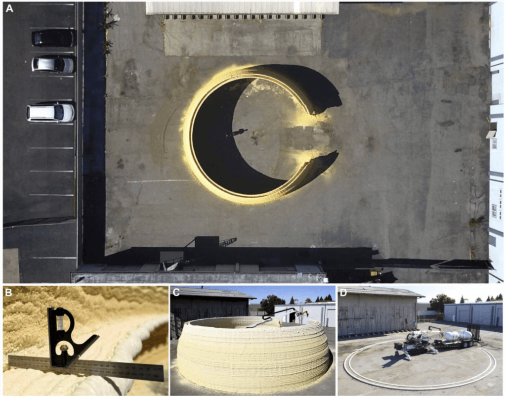 Es wurden verschiedene schnell aushärtende Polyurethan-Schaumstoffe getestet. Das Team entschied sich für den Dow Chemical’s Froth-Pak-Isolierschaum, da die Geschwindigkeit der Aushärtung, die Leichtigkeit der Sprühkontrolle und die Konsistenz der Schichtablagerung für diesen Druck am besten geeignet war. Damit konnte erfolgreich eine offen Kuppelschalung, welche einen Druchmesser von 14,6 m und eine Höhe von 3,7 m hat, gedruckt werden. In nur 13,5 Stunden haben die Forscher dieses Projekt fertiggestellt.