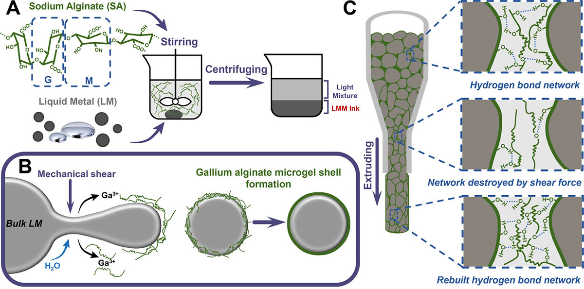Die 3D-druckbare LMM-Tinte soll das ändern. Die Forscher rührten Gallium mit einer wässrigen Natriumalginatlösung, die Ga 3+ mit Natriumalginat vernetzt, um mikrogelbedeckte flüssige Metalltröpfchen zu bilden. Durch die Mikrogelhüllen verbesserte sich die Druckbarkeit der flüssigen Metalltröpfchen und konnten im 3D-Druckverfahren mit direkter Tinte genutzt werden. Erste Versuche zeigten, dass die LMM-Schaltungen nicht wirklich leitfähig waren, sich aber durch leichtes Dehnen aktivieren ließen. Das Dehnen bricht die nicht leitenden Alginatbindungen in der Tinte. Das Einfrieren und Pressen der 3D-gedruckten LMM-Schaltungen reaktiviert die 3D-gedruckten LMM-Schaltungen, wodurch sie auch in einer extremen Umgebung wie dem Weltraum genutzt werden könnte. Sie testeten die aktivierten 3D-gedruckten Schaltungen und merkten, dass sie viele der für flexible Elektronik wesentlichen Eigenschaften aufwiesen. Sie waren sehr leitfähig, boten eine signifikante Widerstandsreaktion auf Dehnung mit kleiner Hysterese und eine große Haltbarkeit gegenüber nicht planaren Kräften.