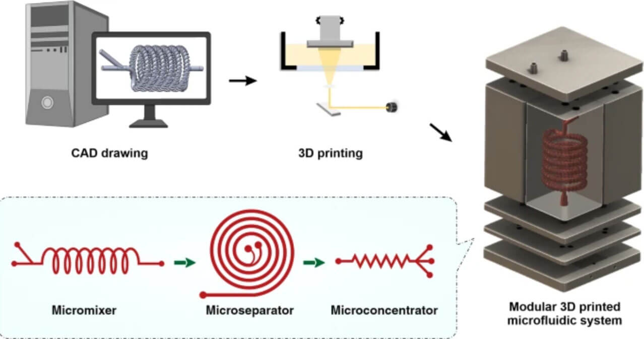 Bei der Mikrofluidik werden Flüssigkeiten auf mikroskopischer Ebene präzise gesteuert, die zur Manipulation von Zellen und Partikeln verwendet werden kann. Der Fortschritt in der additiven Fertigung ermöglicht den Bau solcher mikrofluidischen Geräte direkt und bringt schnelleres Prototyping und Bauen solcher Systeme mit sich.