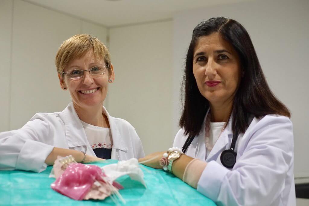 Die Forscher Mónica Arguís (links) und Meritxell Arenas (rechts) zeigen die beiden Maskentypen (Bild © URV).