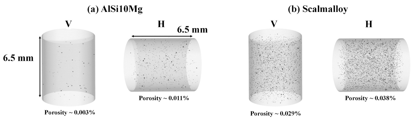 Die Aufbauorientierung hatte keinen signifikanten Einfluss auf die Kornstruktur der Al-Teile. Horizontale Proben wiesen viel höhere Mengen an volumetrischen Defekten auf als ihre vertikalen Gegenstücke. Die geringste Variation der Defektdichte zwischen den vertikalen und horizontalen Aufbauten wiesen Scalmalloy und AD1 zwischen den vertikalen und horizontalen Aufbauten auf, was durch die relativ niedrige Wärmeleitfähigkeit dieser beiden Legierungen erklärt wurde.