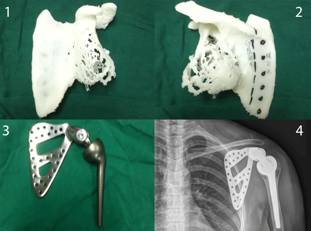 Die Bilder zeigen die Reihenfolge der Rekonstruktion des Schulterblatts. 1) Aus den Scans konnte ein Abbild des Original-Schulterblatt gedruckt werden. 2) Anpassungen für Transplantation. 3) Schulterblatt aus Titanium gemäß 3D-Druck-Vorlage. 4) Nach erfolgter Transplantation (Bild © newsgd.com).