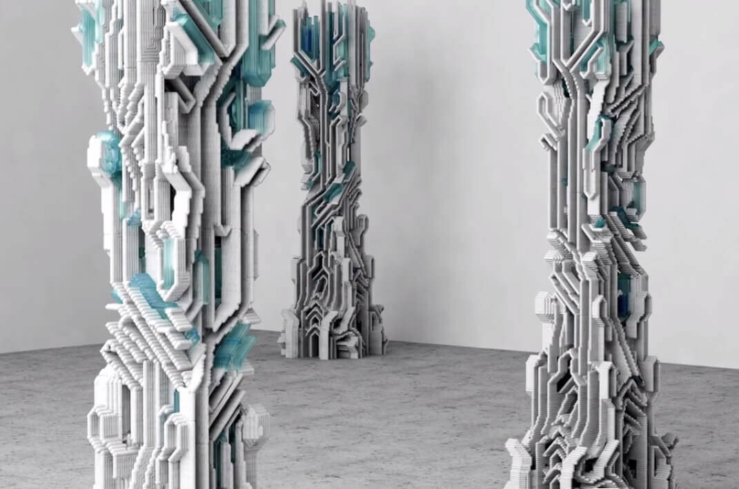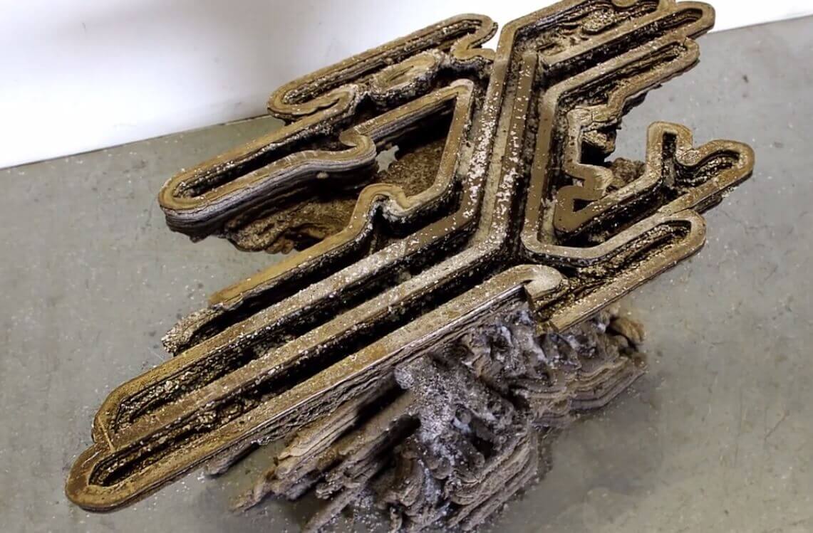 Das Studenten-Team von Amalgamma haben das „Fossillized“-Projekt gestartet, mit dem Ziel eine neue Methode zum 3D-Druck von Betonstrukturen zu erforschen. Die neue Methode verbindet zwei existierende Technologien miteinander. Ein Extruder trägt das Zementgemisch auf, der an einem industriellen Roboterarm montiert ist und eine Auflösung von 1 cm bietet.