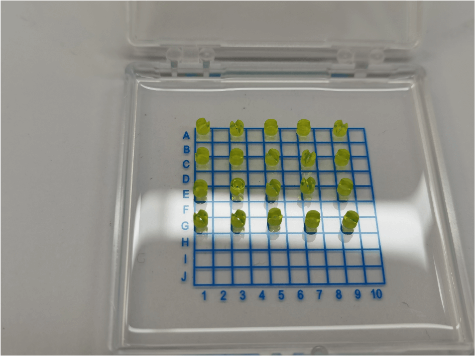 Die spektroskopischen Bauteile mit den Abmessungen 2,4 x 2,4 x 2 mm3 entstanden in Schichthöhen von 10 µm bei einer gesamten Druckzeit von 4 bis 5 Stunden für 18 Stück. Buchman gefällt, dass der 3D-Drucker von BMF verschiedene Düsen schnell, mit der richtigen Präzision und in großen Mengen herstellen kann. Das ausgehärtete RG-Photopolymer hat gut geeignete Zug- und Biegeeigenschaften und hält den Druckanforderungen stand. Alle benötigten Teile wurden in wenigen Wochen produziert.