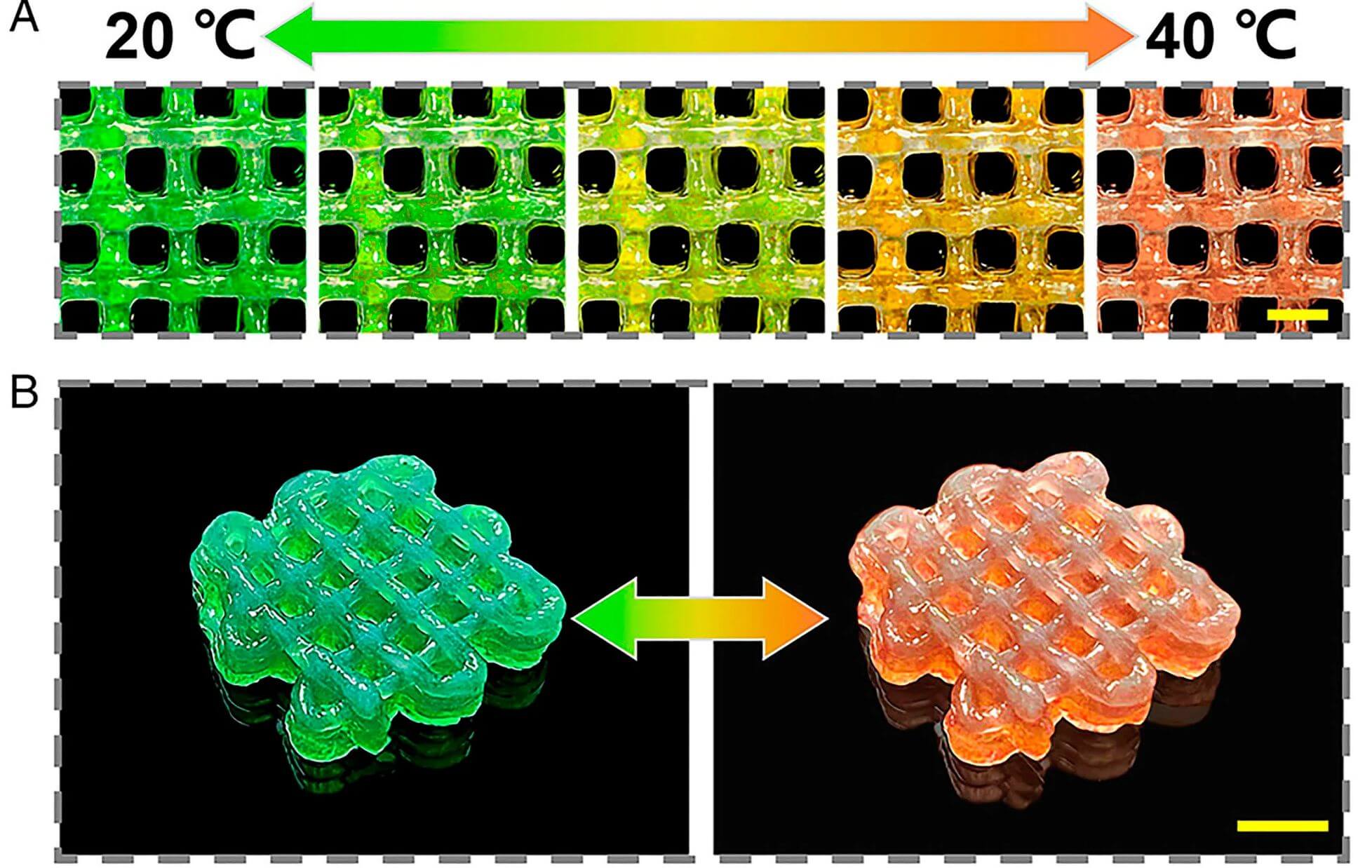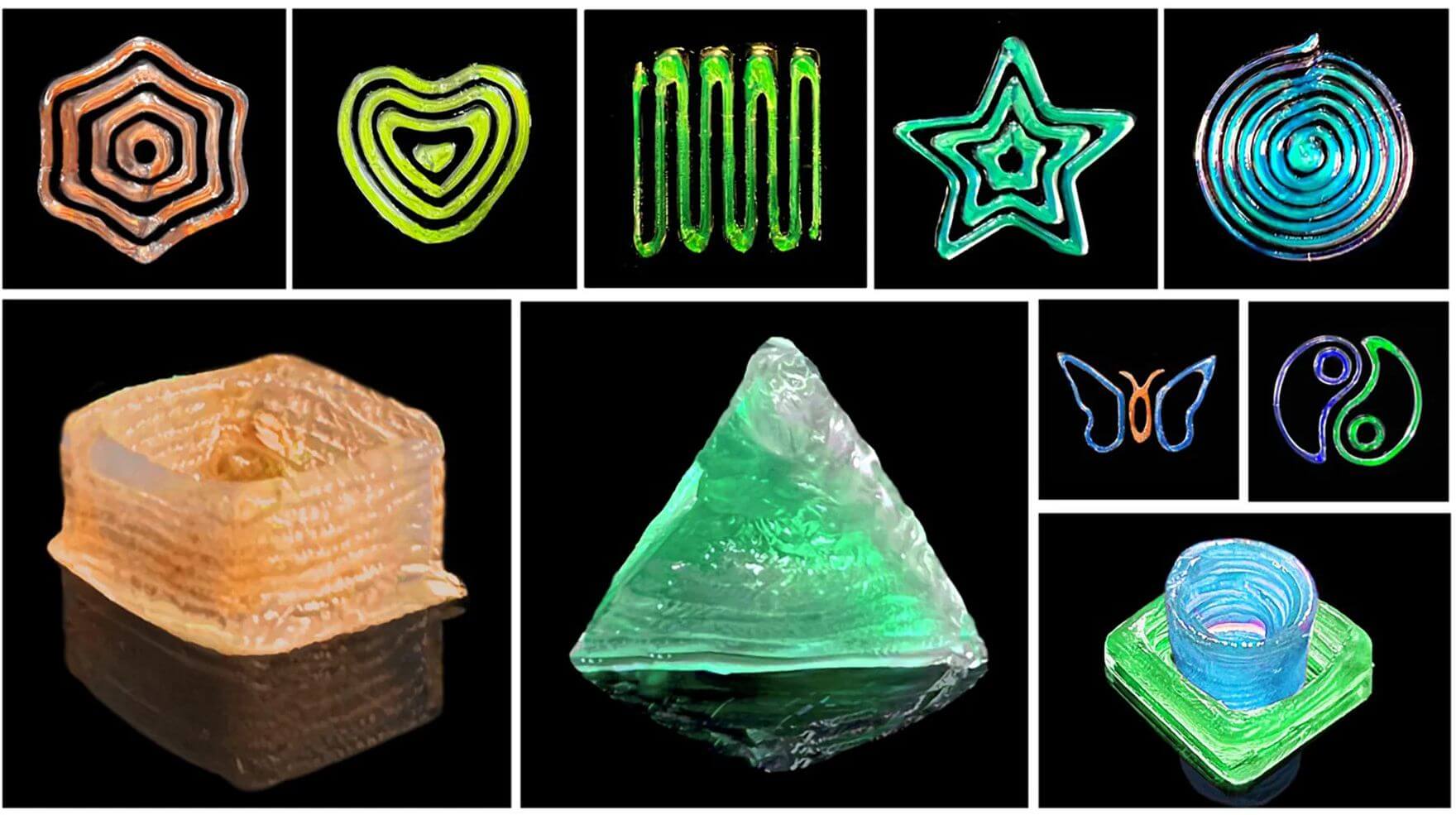 Sie kombinierten Gelatine und Hydrogel mit Hydroxypropylcellulose (HPC) und cholesterischen Cellulose-Flüssigkristallen (CLCs), um ihr neuartiges 3D-Druck-Material zu formulieren. Dabei stellten sie fest, dass HPC CLCs entwickeln, die leuchtende und metallische Farben erzeugen können. Die Integration eines thermisch ansprechenden Hydrogels ermöglichte es, den Prozess durch UV-Licht auszulösen. Das Team druckte Prototypen mit unterschiedlichen Formen auf flachen Oberflächen, wie zum Beispiel Alufolie und eine Laborbank, um die Farbverschiebungsfähigkeiten des Materials zu bewerten.