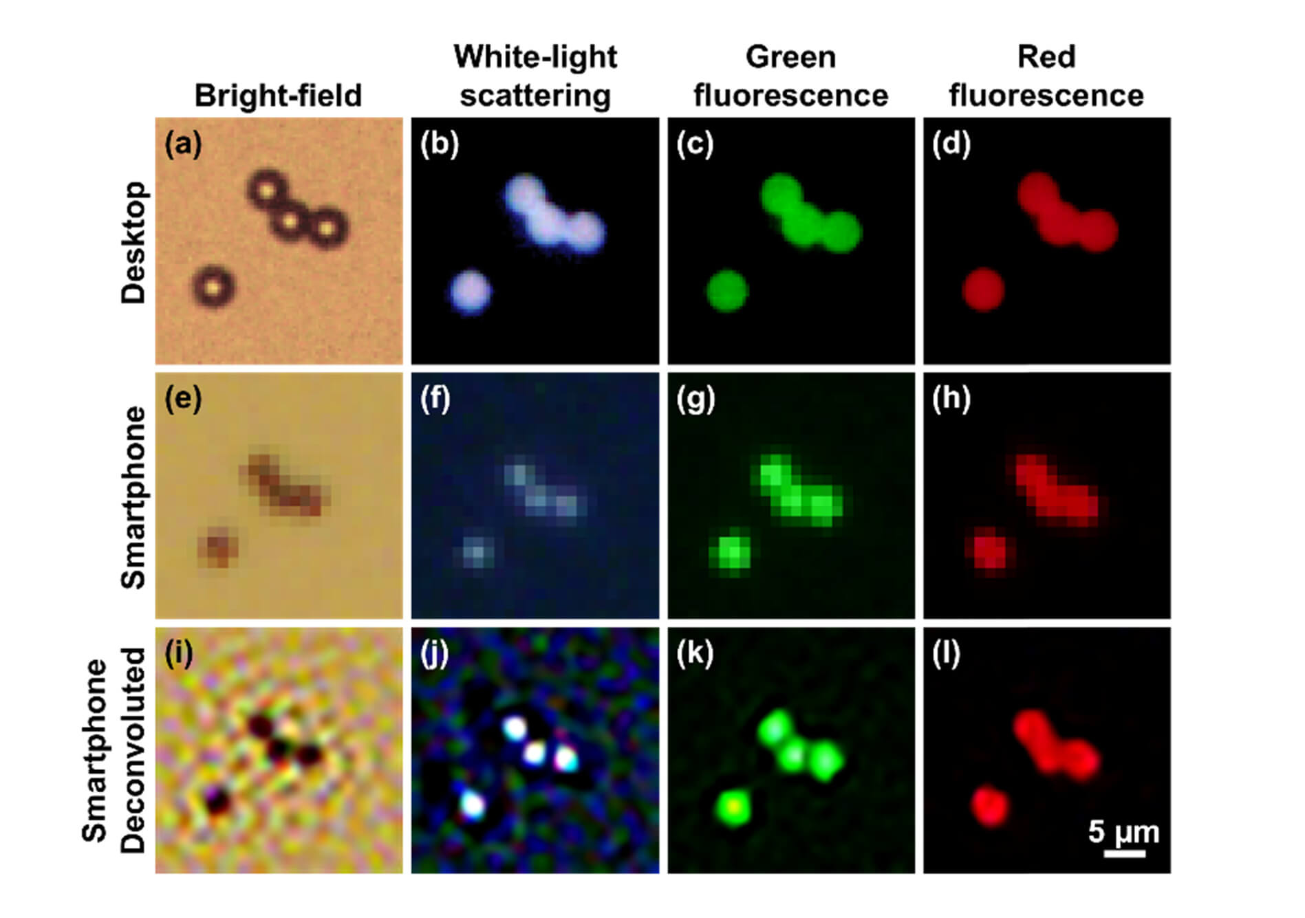 Mehrfarbige fluoreszierende Tropfen, abgebildet mit: (obere Reihe) 100x Tischmikroskop, (mittlere Reihe) Smartphone-Mikroskop und (untere Reihe) entfaltete Smartphone-Bilder (Bild © Yulung Sung, Fernando Campa, and Wei-Chuan Shih).