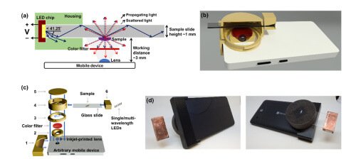 Die Linsen selbst verwenden eine LED-Beleuchtung und eine 3D-gedruckte Kassette, die ein Glasobjektträger hält. Sowohl die LED als auch die Kassette sind an einem Smartphone angebracht. Kommt Licht von der Seite des 1 mm dicken Objektträgers, wandert es durch das Glas und stellt das mikroskopische Bild dar.