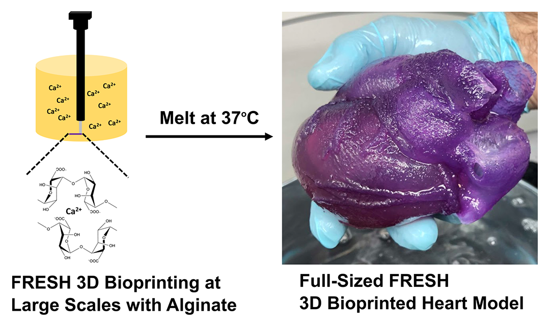 Da die Forscher keinen passenden 3D-Drucker für das menschliche Herz in Originalgröße hatten, haben sie einen eigenen Bioprinter entwickelt. Dieser wurde speziell für die Aufnahme des Gel-Trägerbads entwickelt. Die gewünschte Größe konnte dank des nun ausreichend großen Bads additiv gefertigt werden. Das Herzmodell war dem Original dank des natürlichen, weichen Polymers Alginat so ähnlich in der Elastizität.