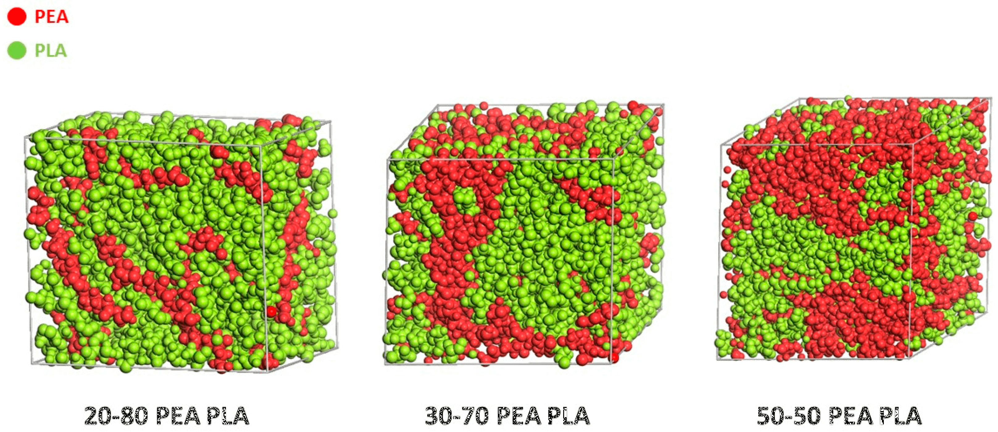 Die bereitgestellte Grafik veranschaulicht deutlich, wie sich PLA (grün) und PEA (rot) bei verschiedenen Mischverhältnissen in einem dreidimensionalen Raum verteilen. Während bei einem Verhältnis von 20 % PEA zu 80 % PLA die beiden Materialien noch weitgehend gleichmäßig vermischt erscheinen, bilden sich bei höheren PEA-Anteilen (30–70 bzw. 50–50) zunehmend getrennte Cluster. Diese bildliche Darstellung unterstützt die quantitativen Simulationsergebnisse zur Phasenseparation und Polymerkompatibilität.