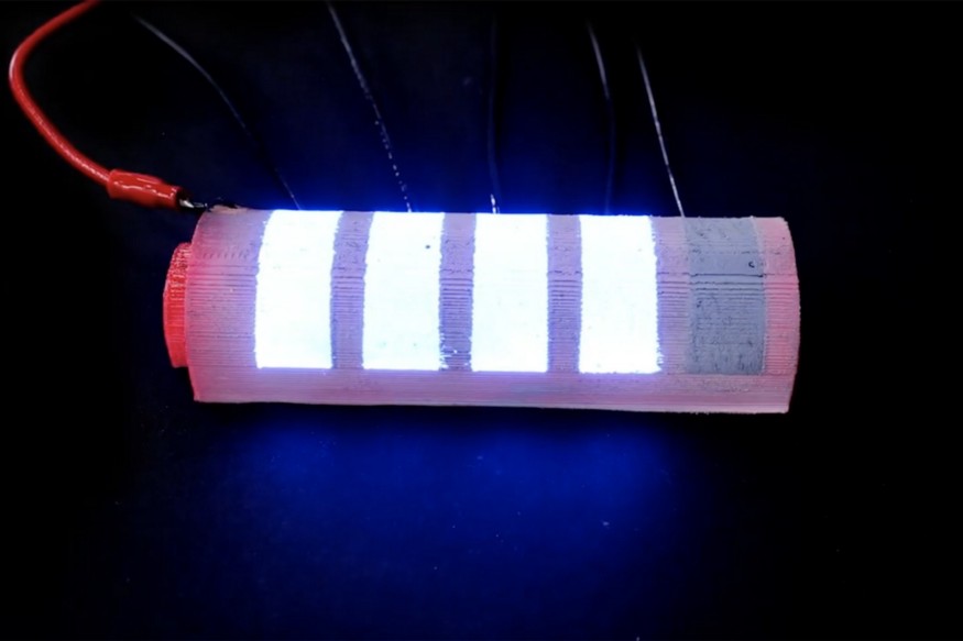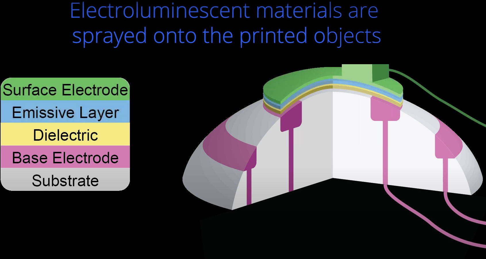 Zuerst werden Objekte aus leitfähigem und isolierendem Kunststoff mit einem 3D-Drucker hergestellt. Dann werden Elektrolumineszenzmaterialien auf die Objektoberfläche gesprüht. Das 3D-Objekt und die Basiselektrode bestehen dabei aus mehreren Materialien. Zum Schluss wird die dielektrische Schicht aufgesprüht und dann die Emissionsschicht unter UV-Licht.