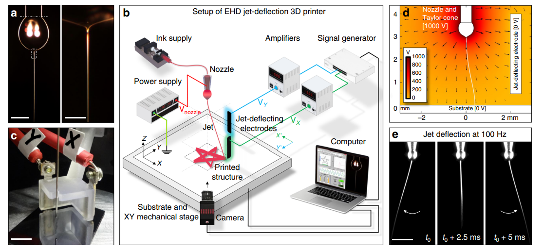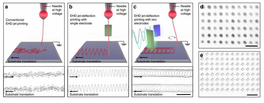 Die Forscher suchten einen Weg, den Hochgeschwindigkeitsdruck freizusetzen, indem sie die Strahlbahn ablenken und kontinuierliche elektrifizierte Strahlen steuern. Diese beeinflussen das Drucksubstrat. Für die Forschung wurde ein EHD-Drucker angepasst, indem der Strahl mit zusätzlichen Elektroden zur Modifikation des elektrischen Feldes umgeben wurde.