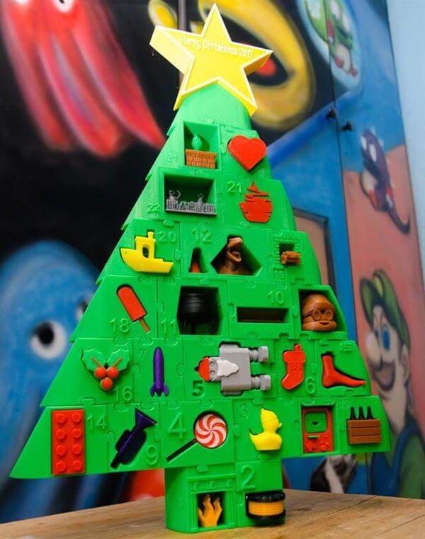 Mehrtägige Drucke gab es bei komplexeren Dingen wie einem Raumschiffmodell, bunten Figuren wie Charlie Brown und Lucy, einer Plastikmaschine, einem großformatiges Lego Go-Kart (inspiriert von Matt Denton von Mantis Hacks) und sein Favorit: Ein wirklich aufwendiger 3D-gedruckter Adventskalender. Der Adventskalender war eine gemeinschaftliche Arbeit mit seinen Freunden. Das Design stammt von Peter Leppik und war aus dem Jahr 2012. Van den Bon gestaltete ihn in Fusion 360 als eine Art Blanko-Weihnachtsbaum neu.
