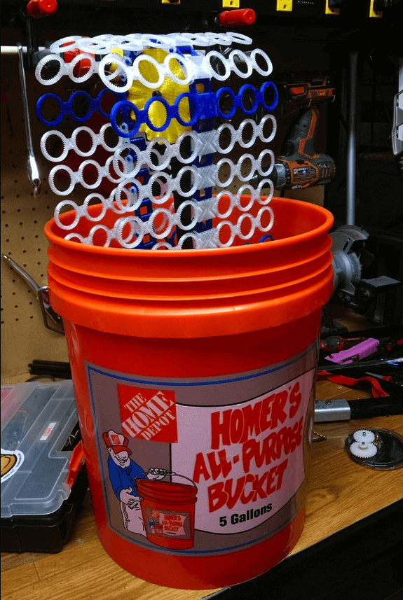 Ausgestattet ist der „Eimer“ mit einer 4 mm Wellenkupplung, die das Kettenrad mit einem 60RPM Getriebemotor verbindet und die gesamte Konstruktion zum Laufen bringt. Zusätzlich wurde diese an eine Aluminium-Extrusion festgeschraubt, die das Ganze im Eimer zusammenhält. Bis zu 40 Apparaturen, an denen jeweils 6 3D-Seifenblasen-Ringe angebracht sind, können dann so in Betrieb genommen werden und die Seifenblasen freilassen. Die Ringe werden durch die Kettenkonstruktion vertikal in den Eimer getaucht, sodass sie alle zehn Sekunden wieder auftauchen, um so die Tausenden von Seifenblasen freilassen zu können.