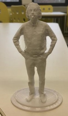 Vor dem eigentlichen Druck muss die Düse eine Temperatur von 220 Grad Celsius erreichen. Als Druckmaterial werden klassische Kunststofffilamente verwendet, wovon 50 Meter auf eine Rolle passen und in der Regel in Kilogramm angegeben. Für Einstein wurden acht Meter verbraucht. An immer mehr Schulen, Hochschulen und anderen Bildungseinrichtungen werden 3D-Drucker eingesetzt.