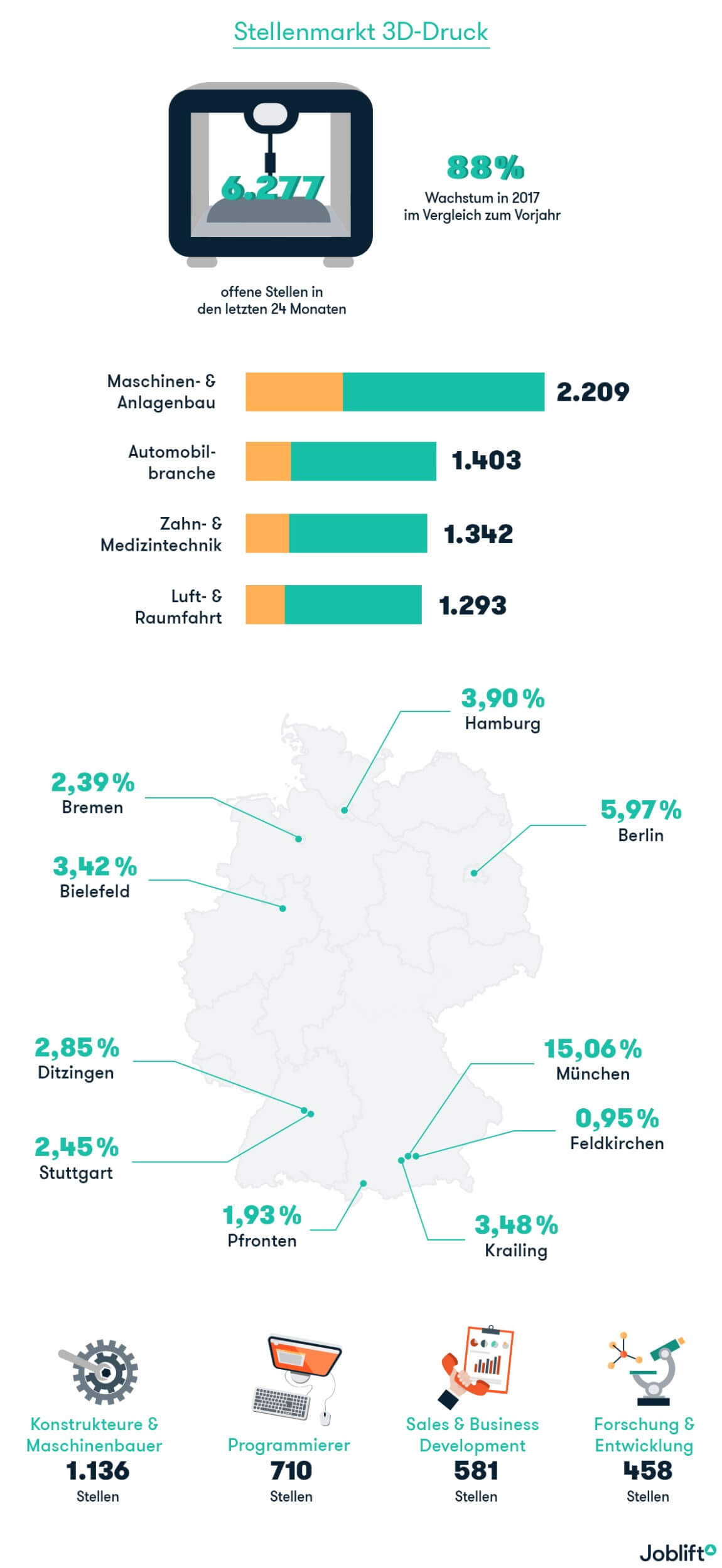 Laut Joblift gehe die technische Weiterentwicklung mit einer spürbaren Preissenkung aller erforderlichen Komponenten einher und ermögliche kleinen und finanzschwächeren Unternehmen auch die Arbeit an und mit 3D-Druckern. Allein in der bayrischen Hauptstadt München befinden sich 15 Prozent aller ausgeschriebene 3D-Druck-Stellen und ist damit – zumindest auf Joblift – die Hochburg des 3D-Drucks. München, Hamburg und Berlin liegen auf den Plätzen 1 bis 3 der zehn meistausschreibenden Städte. Die EOS GmbH und die DMG Mori AG waren 2017 die zwei Firmen mit den meisten Stellenausschreibungen von 3D-Druck-Jobs, so Joblift.