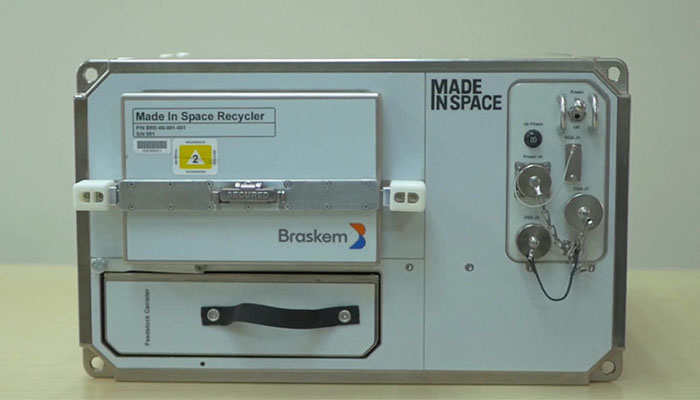 Made in Space hat sich als Zulieferer der NASA mit seinen 3D-Druckern für den Einsatz in der Schwerelosigkeit einen Namen gemacht. Gemeinsam mit Braskem, einen führenden Hersteller von thermoplastischen Harzen und Biopolymeren, wurde der Braskem Recycler entwickelt. Die erste kommerziell entwickelte Kunststoffrecyclinganlage wird laut einer Pressemitteilung von Made in Space im November auf dem kommerziellen Frachtversorgungsflug von Northrop Grumman an die Internationale Raumstation ISS geschickt.