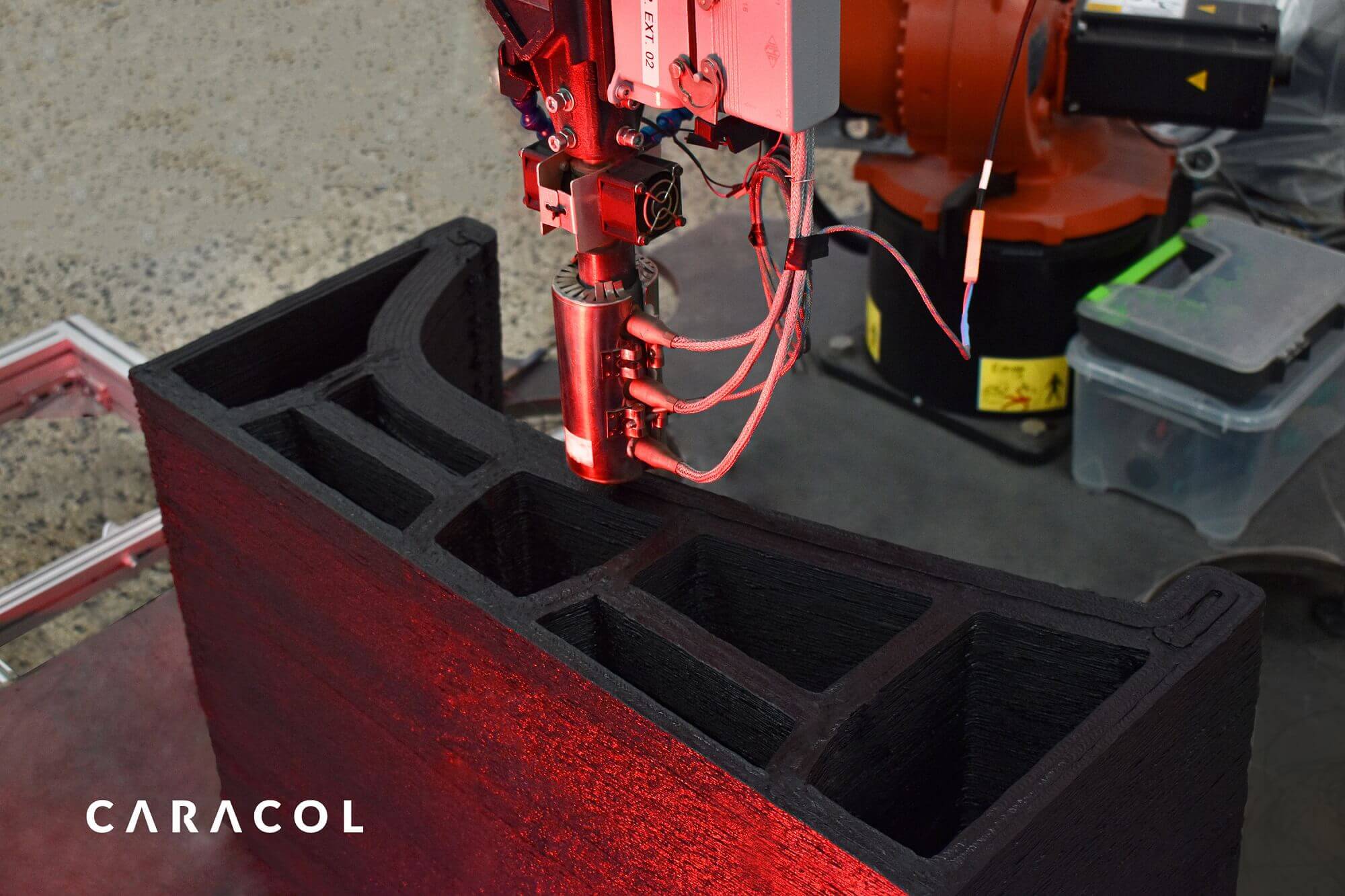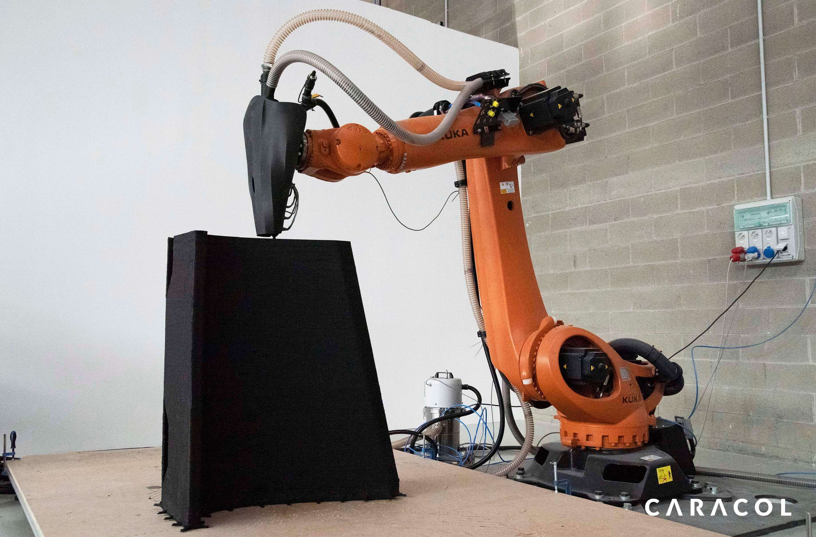 Die Kombination von patentiertem Extrusionskopf, Zufuhrsystem und Druckkopf mit einer proprietären Software-Plattform und dem Einsatz von Roboterarmen ermöglicht es, dass Caracol Komponenten ohne Größenbeschränkung mit fortschrittlichen Verbundwerkstoffen herstellen kann.
