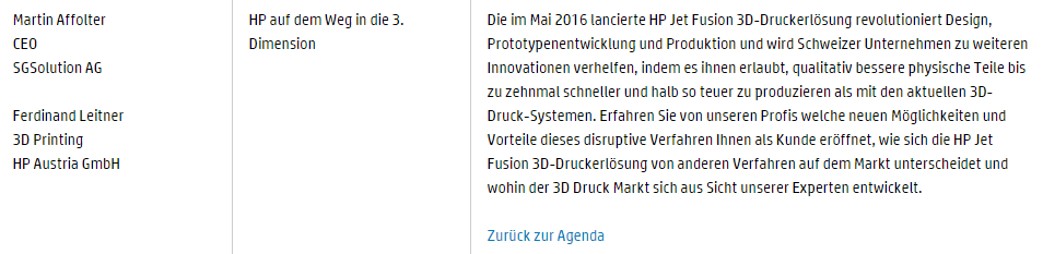 Das Unternehmen präsentierte auf seiner Hausmesse zum ersten Mal seine HP 3D-Drucker in der Alpenrepublik. Im Sommer wird ein 3D-Druckermodell des Herstellers erstmals bei einem Schweizer Kunden aktiviert. Wie Managing Director Adrian Müller von der HP Schweiz ausführt, sei der 3D-Druck eine Chance für sein Unternehmen selbst und die Schweiz. Schweizer Firmen würde sich mit 3D-Druckern die Option eröffnen, die Produktion, die derzeit in Ländern mit geringen Lohnkosten ausgelagert sei, wieder zurück ins Land zu holen.