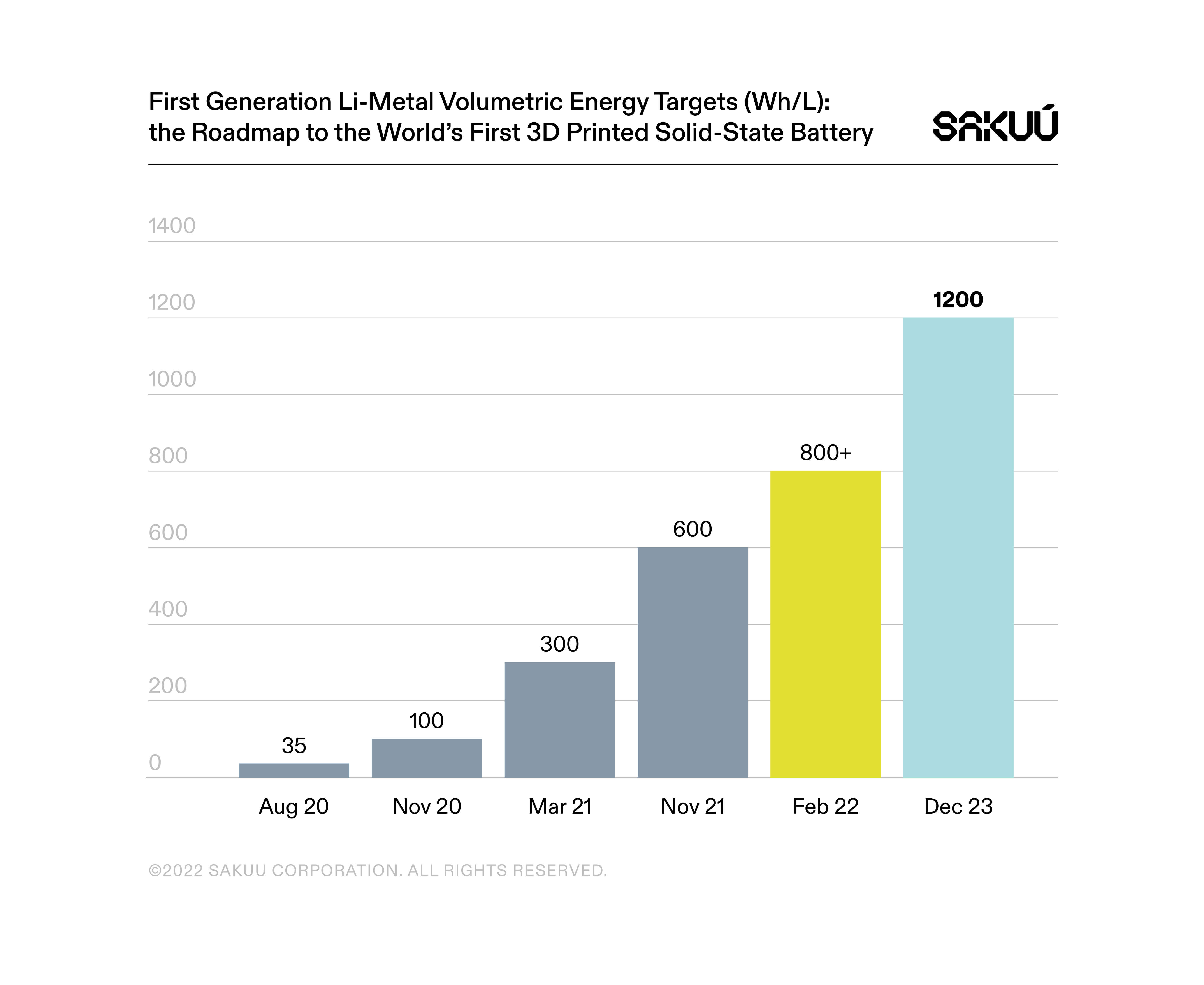 Sakuu sagte, dass dieser Erfolg ein weiterer Schritt auf dem Weg zur vollständig 3D-gedruckten Festkörperbatterien (SSB) mit einer Kapazität von mehr als 1.200 Wh/l bis 2023 ist. Diese soll weitaus leistungsstärker als die heutigen marktführenden Lithium-Ionen-Batterien im Bereich von 500-700 Wh/L sein.