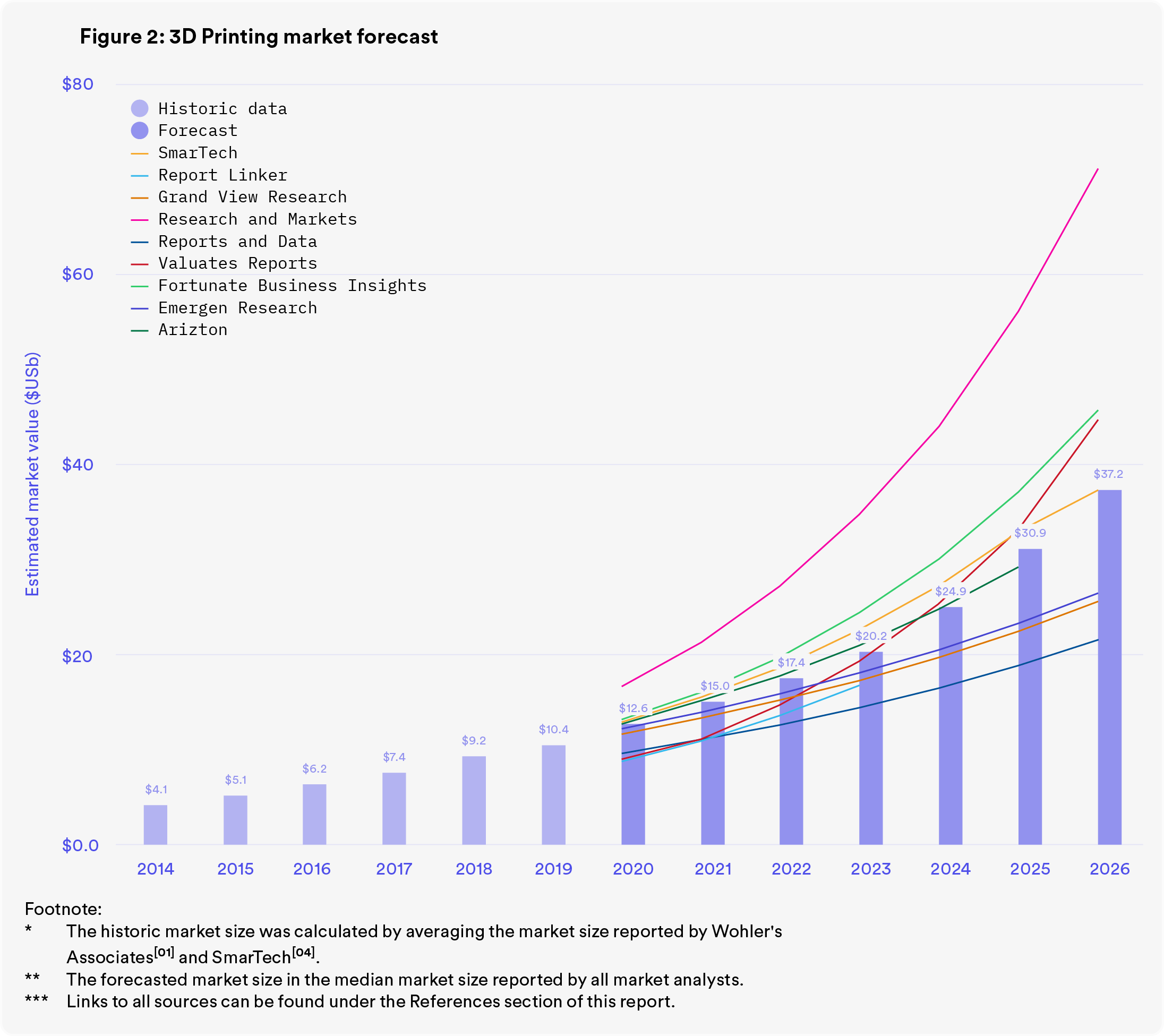 Der Markt für additive Fertigung wird sich in den nächsten fünf Jahren voraussichtlich mehr als verdoppeln. Im Jahr 2026 soll ein Wert von 37,2 Mrd. USD (30,78 Mrd. EUR) erreichen. Die Einschränkungen beim Zugang zu traditionellen Fertigungsmethoden durch die Coronavirus-Pandemie im Jahr 2020 führte dazu, dass der 3D-Druck zunehmend interessanter wurde. 65 Prozent der Maschinenbauunternehmen erhöhten ihren Einsatz von 3D-Druck im Vergleich zu 2019.