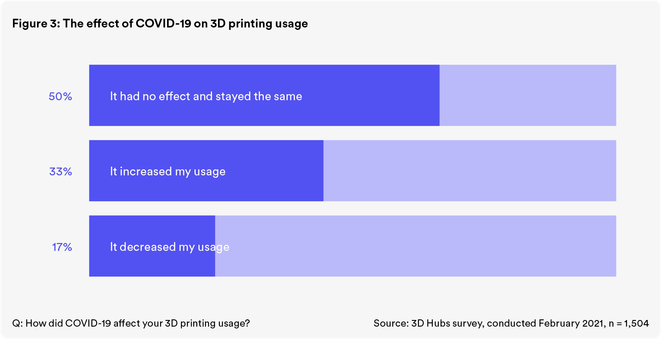54 Prozent der Maschinenbauunternehmen verwendeten mehr 3D-Druck für Endanwendungsteile im Jahr 2020. 30 Prozent der Maschinenbauunternehmen haben den 3D-Druck für funktionale Endverbrauchsteile beibehalten. 3D Hubs geht davon aus, dass der 3D-Druck für viele nicht mehr nur noch eine Rapid-Prototyping-Technologie ist.