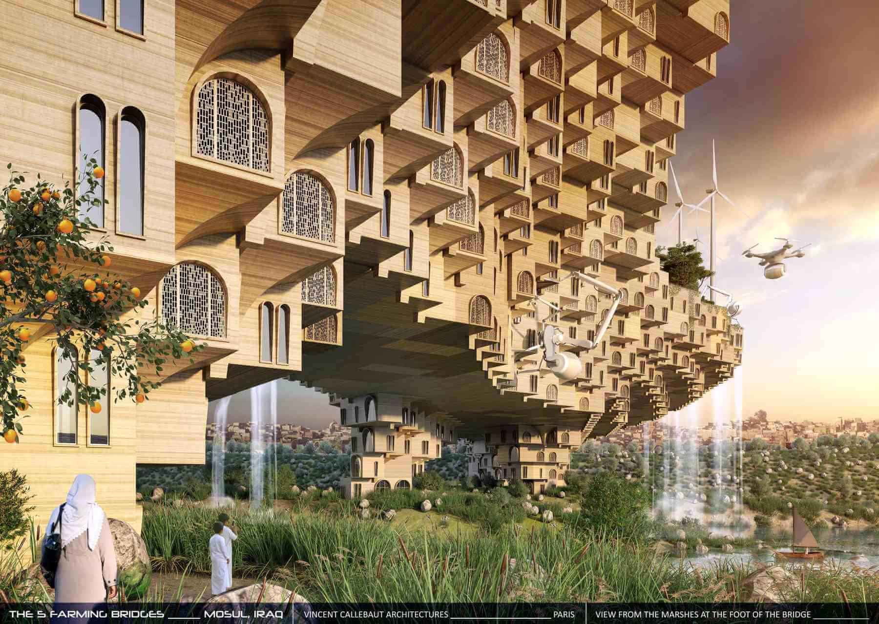 Die irakische Stadt Mossul wurde in den letzten Jahren fast vollständig zerstört. Am Wiederaufbau beteiligt sich auch der französische Architekt Vincent Callebaut. Dieser möchte mit seinem Unternehmen die Stadt mit Hilfe des 3D-Drucks neu aufbauen und zu einer grünen Oase verwandeln. Insgesamt sollen den Fluss Tigris fünf Brücken überspannen, welche mit der additiven Fertigungstechnologie errichtet werden. Auf diesen Überführungen sollen dann Wohneinheiten entstehen. Für die notwendige Stabilität dieser Häuser sorgen spezielle Spitzbögen, wobei die Wohnungen selbst auf- und ineinander gestapelt wirken sollen. Die Wohnungen werden dabei in unterschiedlichen Größen konzipiert.