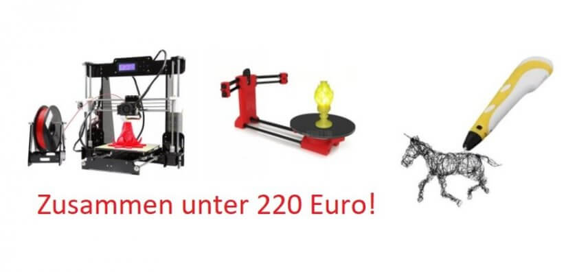 Ein Set aus 3D-Drucker, 3D-Stift und 3D-Scanner für unter 220 Euro – zu schön um wahr zu sein? Nein, keineswegs. Vor ein bis zwei Jahren war das noch undenkbar, aber mittlerweile sind auch namhafte 3D-Druck-Produkte für wenig Geld erhältlich. Im Rahmen unserer Aktion „TOP-Angebote für die 2.Adventswoche“ sind uns ein 3D-Drucker, ein 3D-Stift und einen 3D-Scanner aufgefallen, die es zusammen auf eine Warenkorbpreis von unter 220 Euro schaffen, aber natürlich auch einzeln bestellt werden können.