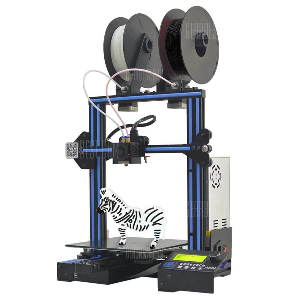 Mit dem Geeetech A10M präsentieren wir Ihnen einen 3D-Drucker, der mit einem Doppelextruder ausgestattet ist. So besteht die Möglichkeit, zwei Filamente gleichzeitig zu verarbeiten und können einen zweifarbigen Druck realisieren. Der Geeetech A10M ist mit einem Aluminiumrahmen ausgestattet, hat eine Größe von 500 x 470 x 288 mm und ein maximales Bauvolumen von 220 x 220 x 260 mm.