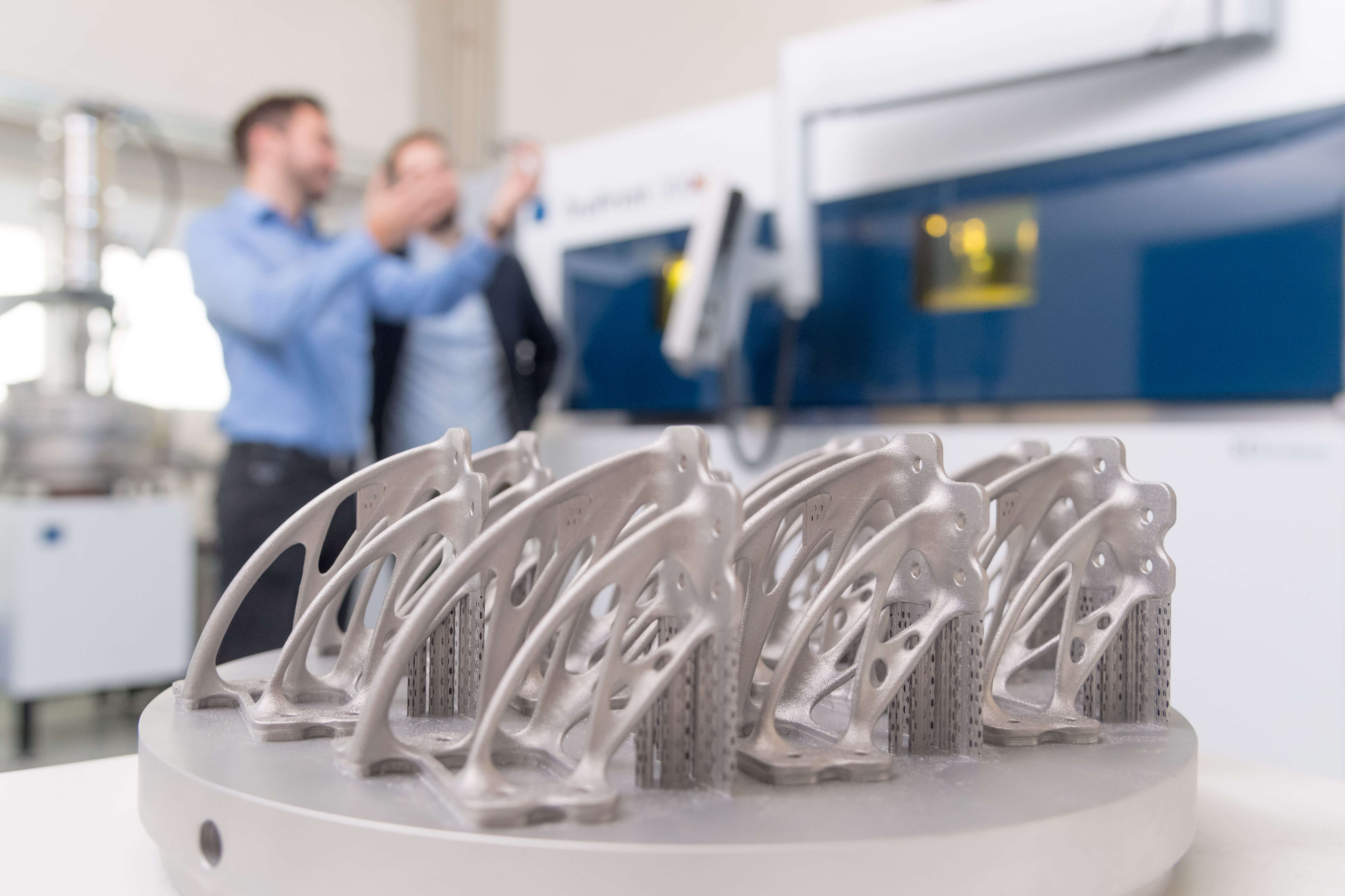 Das Raumfahrtunternehmen Tesat-Spacecom erhielt von TRUMPF eine Halterung für den deutschen Kommunikationssatelliten Heinrich Hertz. Auf dieser sind Antriebe befestigt, mit denen sich Mikrowellenfilter regulieren lassen. Die Firma AMendate hat die Halterung optimiert und das Gewicht um 55 Prozent gesenkt von 164 Gramm auf 75 Gramm. Gedruckt wurde das Bauteil mit dem TruPrint 3000 von TRUMPF.