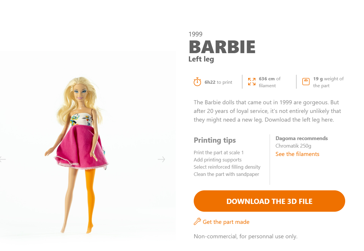 Das französische 3D-Druckunternehmen Dagoma bietet mit der neuen Website Toy Rescue einen Online-Service für den 3D-Druck von Ersatzteilen von Spielzeug. Über die Plattform erhält der User Ersatzteile der populärsten Spielsachen, zu denen bekannte Puppen, Brettspiele, Autos und mehr zählen. Neben eine umfassenden Übersicht aller vorhandenen 3D-Modelle bietet die Website auch eine Suchfunktion zur Suche konkreter Ersatzteile. Noch fehlende Ersatzteile können von der Community ergänzt werden.
