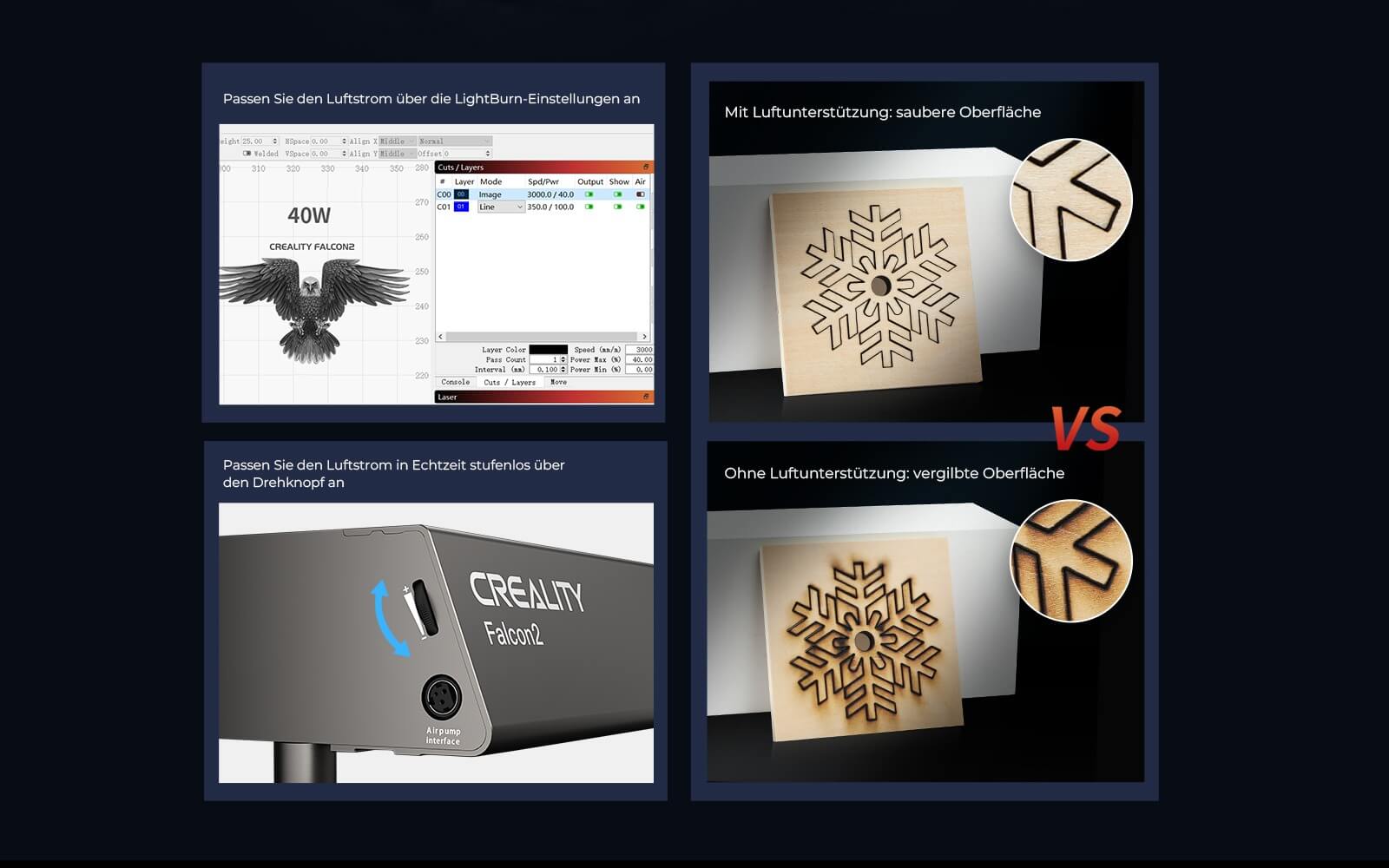 - Air Assist-Funktion zur Rauchentfernung und Linsenschutz