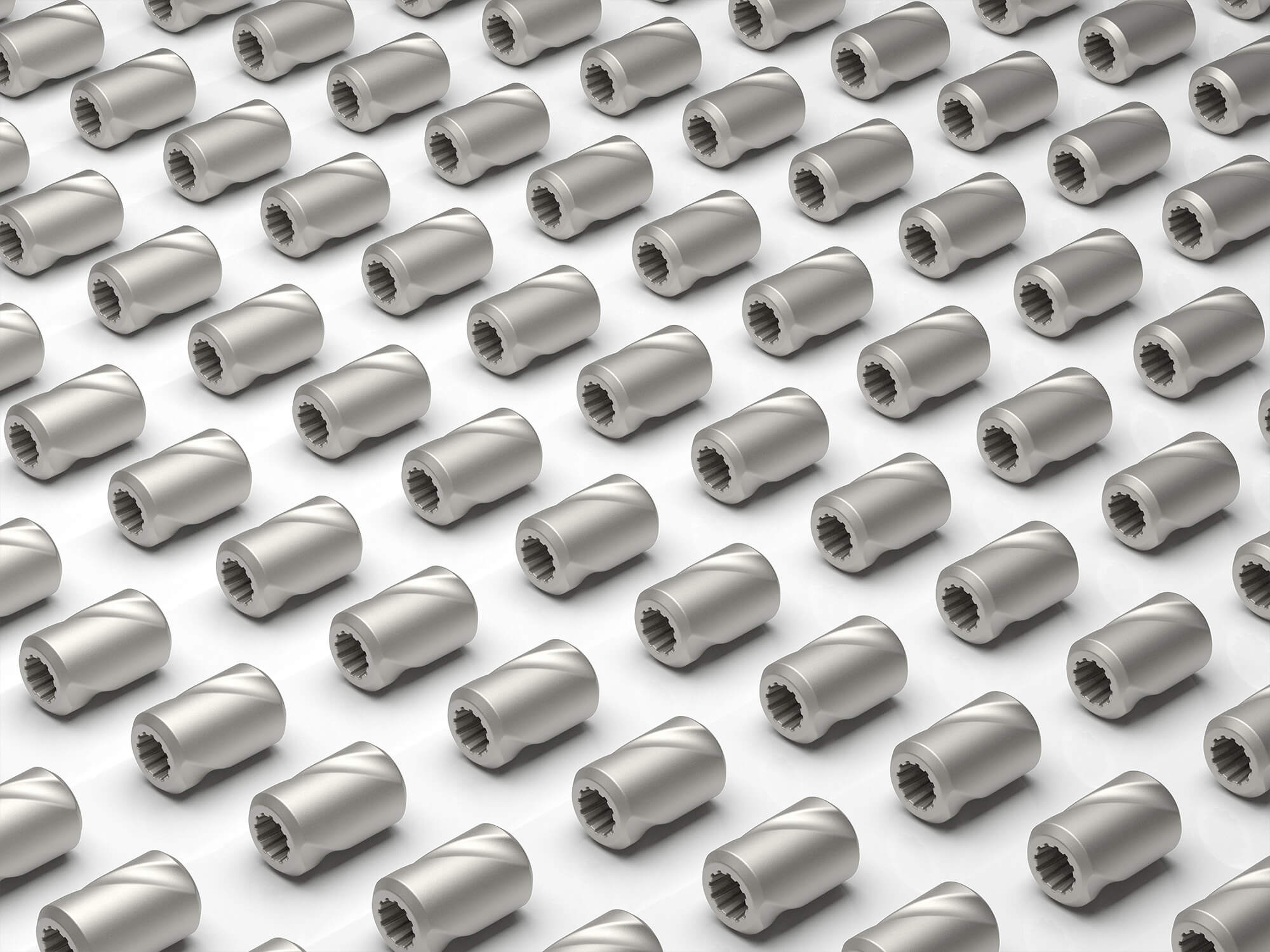 Mit dem Binder Jetting-Metall-3D-Druckverfahren können diese Nocken in einem Schritt produziert werden, was Kosten und Vorlaufzeit des Teils reduziert. Zudem können zahlreiche Nockengrößen in einem Aufbau hergestellt werden. Die Härte und Korrosionsbeständigkeit des D2-Werkzeugstahls sind dafür ideal. Eine lange Lebensdauer wird gewährleistet, da der Nocken mechanisch mit einem Gleitstift zusammenwirkt. Diese Komponenten sind in Maschinen, die in rauen Umgebungen eingesetzt werden.