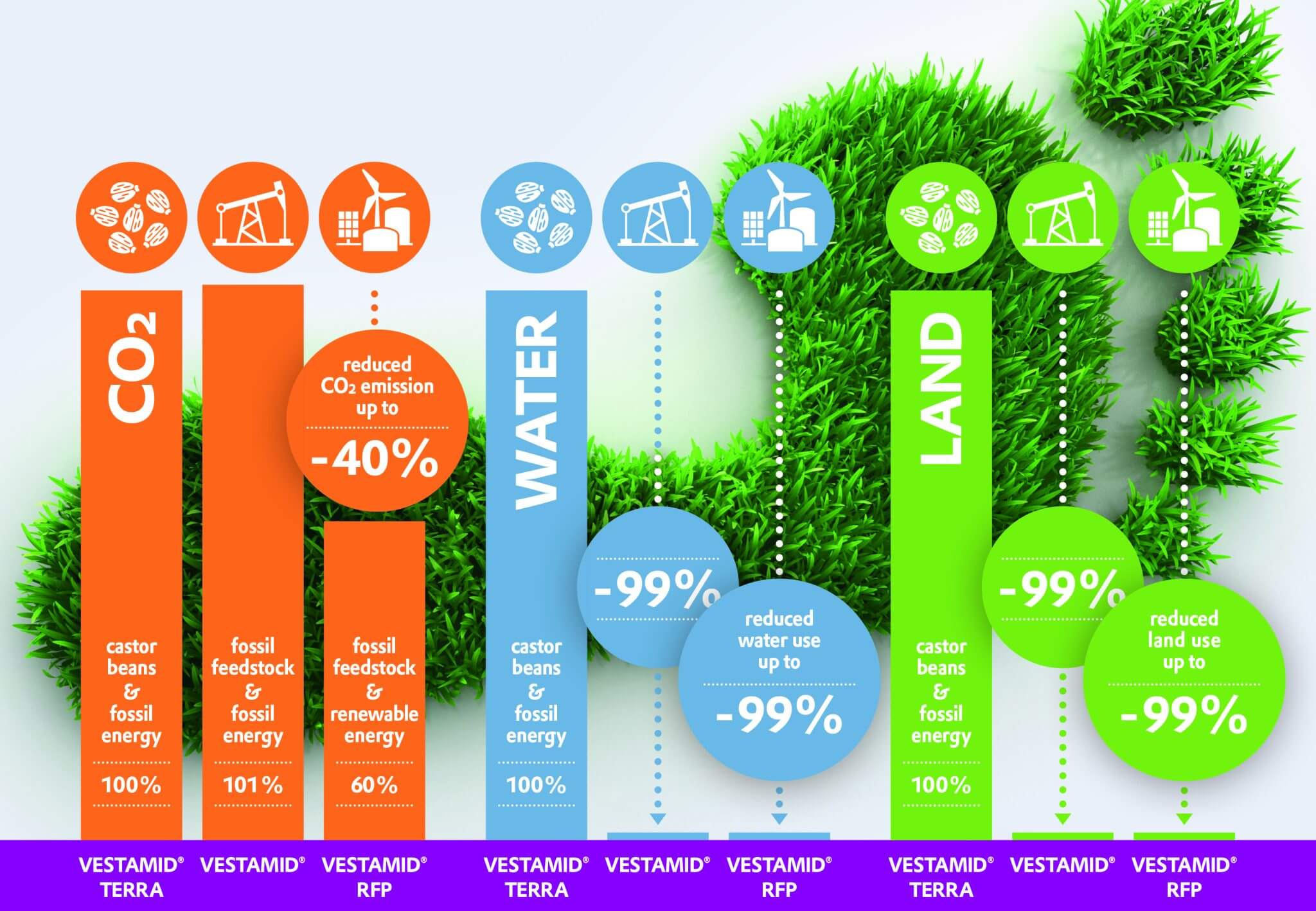 Seit über 50 Jahren stellt Evonik PA12 mit Strom und Dampf aus eigenen Blockheizkraftwerken her. Die Nutzung von Biomethan aus den Abfällen der Anlage halfen dem Unternehmen, die CO2-Emissionen für die Herstellung von PA12 VESTAMID um durchschnittlich 40 Prozent zu senken. Der Wasserverbrauch und die Landnutzung reduzierten sich um 99 Prozent.