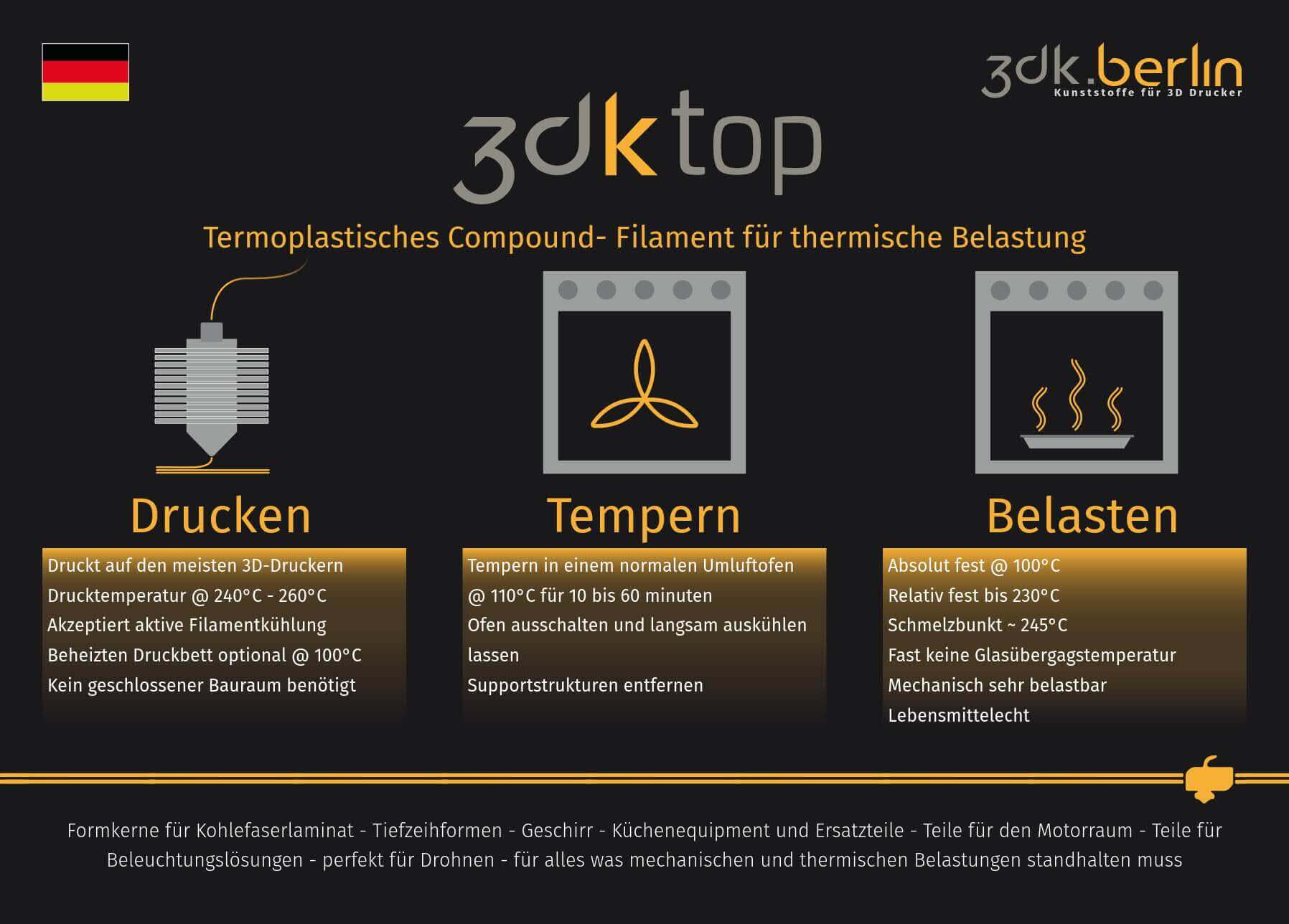 Entwickelt wurde „k-Top“ für Industriekunden, welches nach einer Pilotphase bei einem Automobilzulieferer nun bei im Consumerbereich verfügbar ist. Geeignet ist das Filament für jeden 3D-Drucker, der mit dem FDM-Verfahren arbeitet und 260 Grad Celsius Drucktemperatur erreichen kann. Laut 3dk seien weder ein beheizter Bauraum noch ein beheiztes Druckbett erforderlich.