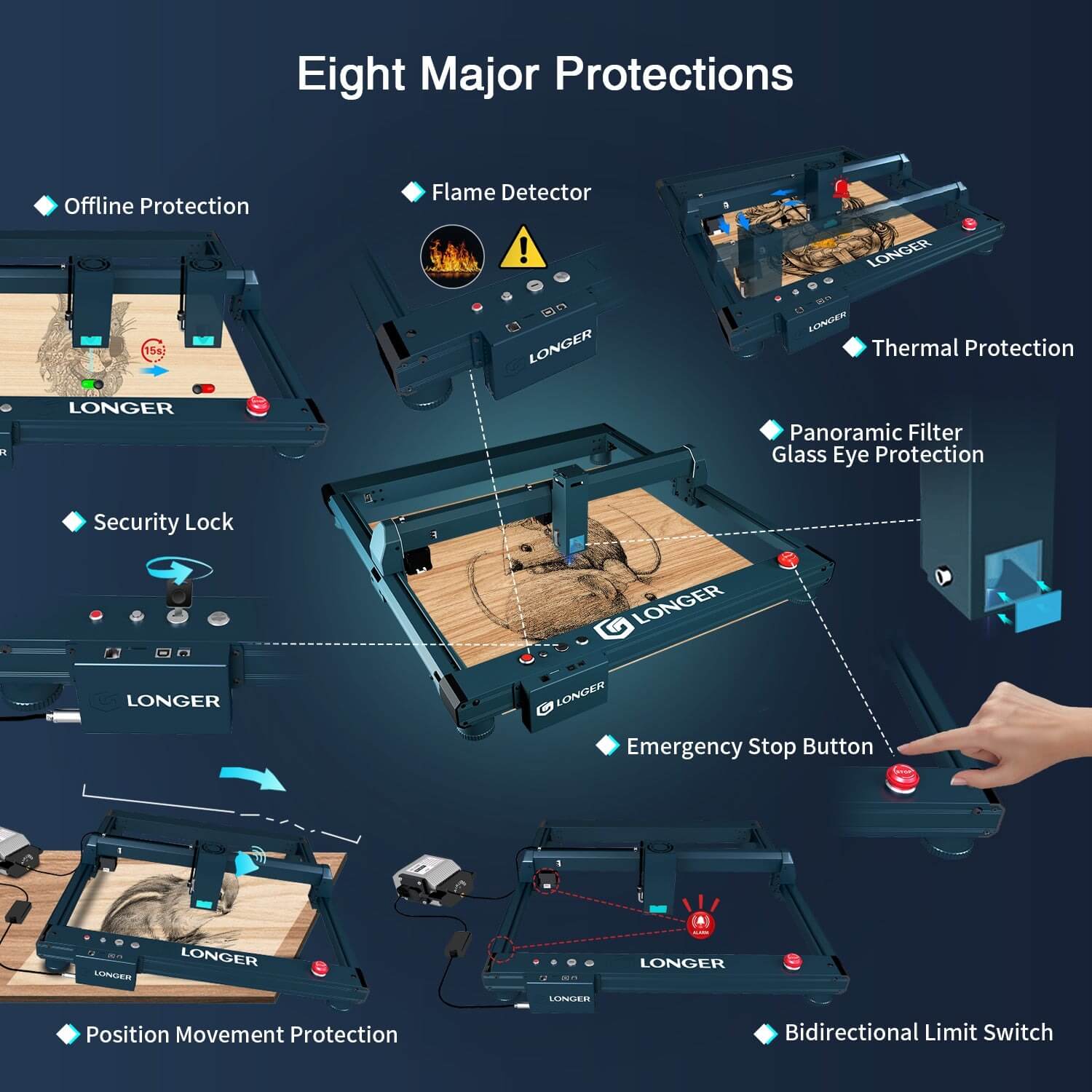 Mit dem hochkonzentrierten Laserstrahl können Anwender mit 20 % erhöhter Schneidfähigkeit schneiden, darunter 25 mm Linde oder auch 50 mm Acryl. Die Luftunterstützung wird dabei automatisch von Lightburn gesteuert. Die Sicherheit kommt mit acht wichtigen Sicherheitsfunktionen, darunter Bewegung, Flamme, Offline, Bewegungslos, Sicherheitssperre, Augenschutz, Not-Aus und Null-Reset. Endschalter können die Position des Lasermoduls genau lokalisieren. Dadurch kann der Lasergravierer einen Alarm auslösen, wenn er erkennt, dass sich der Laser in die falsche Richtung bewegt. Das Linsenmodul bietet eine austauschbare Linse und eine staubdichte Haube, die verhindern soll, dass sie durch Rauch verunreinigt wird.