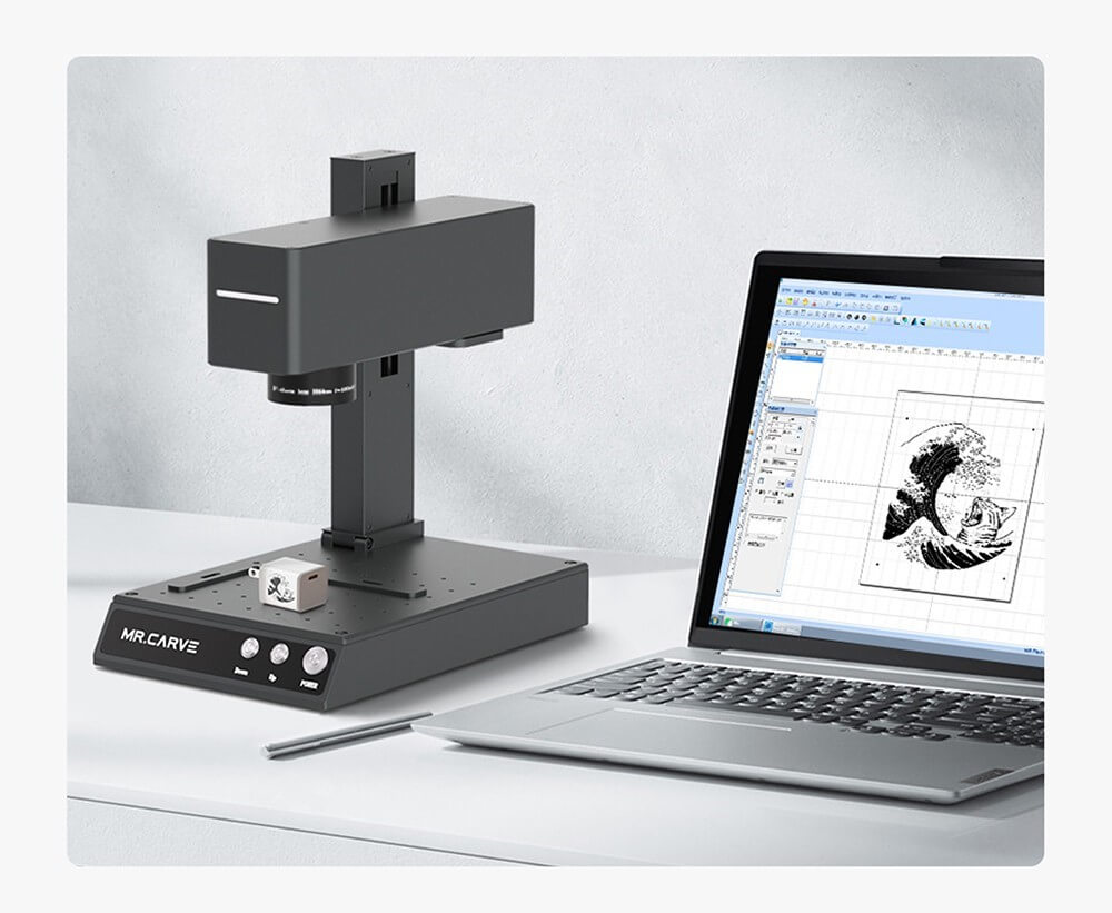 Das integrierte Design mit Feldspiegel sorgt für Geschwindigkeiten von bis zu 10.000 mm/s. Der Infrarotlaser erreicht eine Genauigkeit von 0,001 mm. Das System unterstützt verschiedene Programme zum Entwerfen von Mustern, die im Anschluss graviert werden können. Mr. Carve hat unter anderem ebenfalls eine eigene Software zur Verfügung gestellt. Diese ist auf dem Computer oder dem Mobiltelefon einsetzbar.