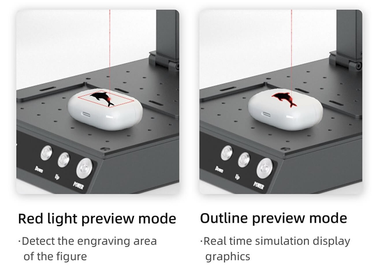 Der Lasergravierer Mr. Carve M4 ist mit zwei Lasern ausgestattet. Das neue Lasermarkierdesign bietet ein 5W 455 nm Blaulichtlaser und einen 2 W 1064 nm roten Infrarotlaser. Das blaue Licht lässt sich zum Gravieren von Papier, Holz und andere Materialien verwenden. Der Infrarotlaser ist ideal zum Gravieren von Metallen, Kunststoffen, Leder und anderen Materialien. Außerdem markiert dieser schneller und raffinierter, wie Mr. Carve erklärt. Zwischen den beiden Lasern kann mit nur einem Knopfdruck gewechselt werden. Der hochpräzise Motor steuert das Anheben der Halterung. Der Fokus wird danach durch zwei Lichtquellen fokussiert.