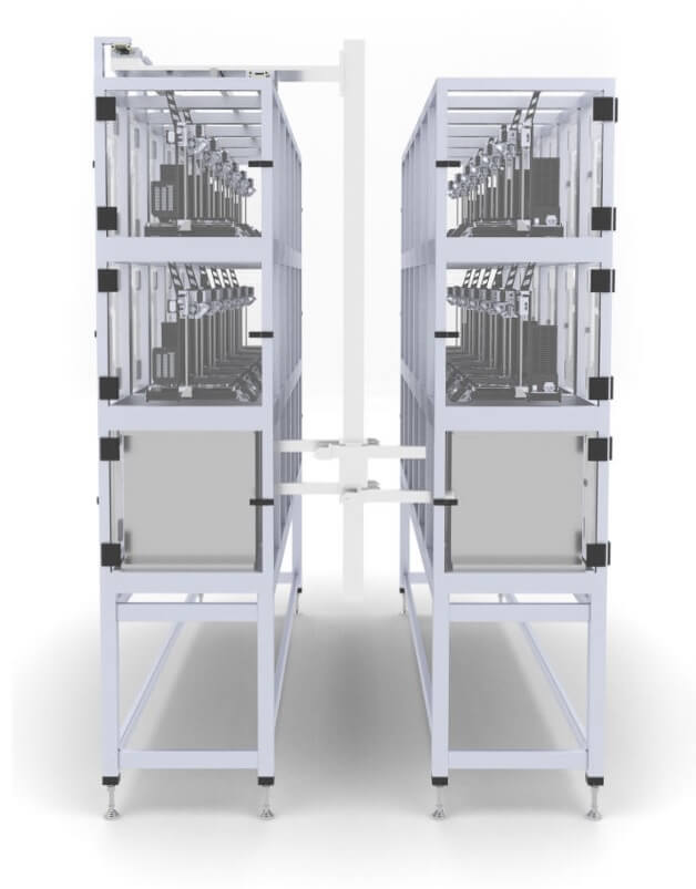 Seitenansicht des print-RACK Automatisierungssystems für den 3D-Druck (Bild © rossmann automation)