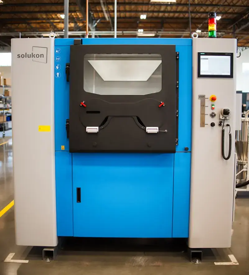 Solukons Flaggschiffmaschine für das Entpulvern, die SFM-AT800-S, nutzt die SPR-Technologie zur effektiven Entfernung von Metallpulver aus den gedruckten Teilen. Dieses System kann Bauteile bis zu 600 x 600 x 600 mm und einem Gewicht von bis zu 300 kg handhaben. Für besonders schwierige Fälle, wie die Entpulverung von Teilen mit schwer zugänglichen Geometrien, bietet Solukon zudem die intelligente Entpulverungssoftware SPR-Pathfinder® an, die die Bewegungsabfolge zur Pulverentfernung optimiert.