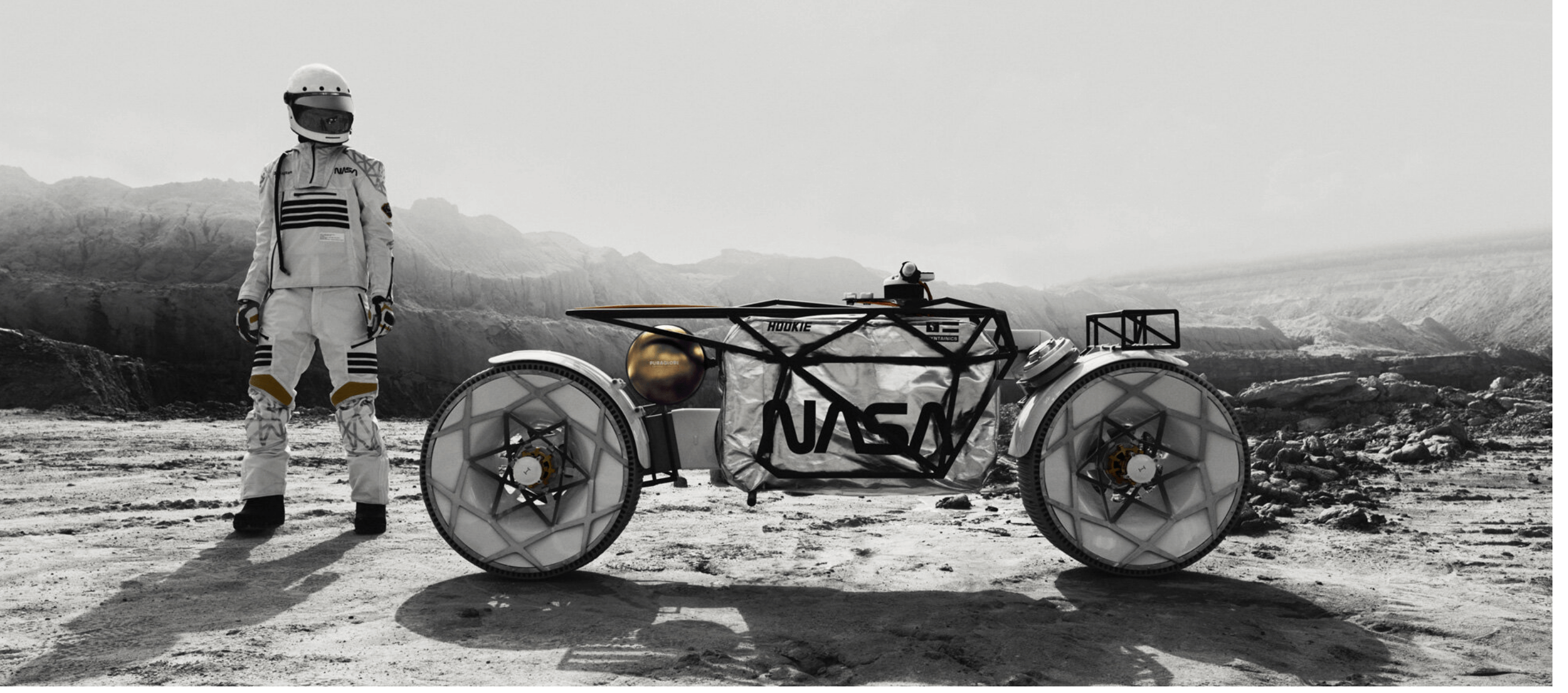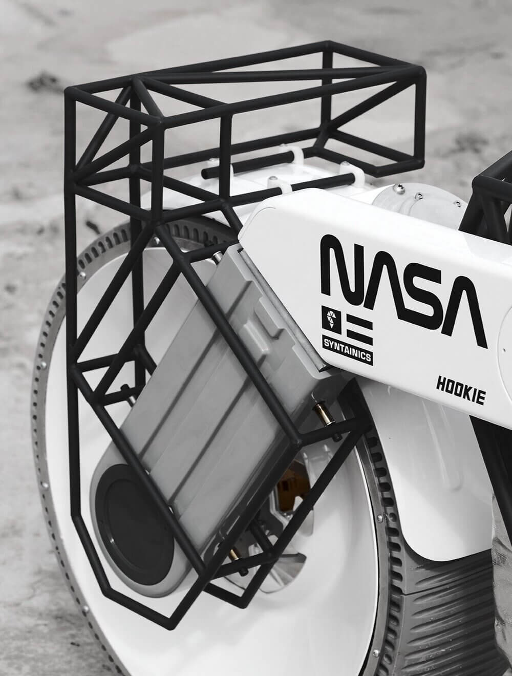 Hookie ist eine deutsche Moto-Denkfabrik, die das erste Moon-Motorradkonzept entwickelt hat. Ihr futuristisches Motorrad „Tardigrade“ wurde für die Erkundung der Mondoberfläche entwickelt und schafft 15 km/h bei einer Batteriereichweite von fast 110 Kilometer. Sie verfügt über mehrere 3D-gedruckte Komponenten und austauschbare Airless-Reifen. Damit die NASA darauf aufmerksam wird, entwarf Hookie einen Weltraum-Motorradhelm- und -Anzug aus Hightech-Materialien wie Kevlar und Nomex mit dem NASA-Logo.