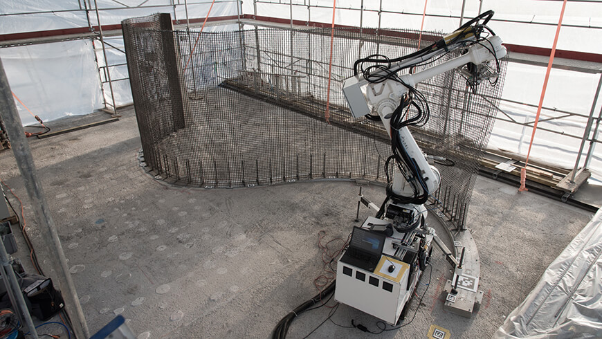 Wie bei einem 3D-Drucker ist beinahe jede gewünschte Form möglich. Am Computer wird ein Modell erstellt, dass der Roboter mit Stahlgitter erbaut. Ausgefüllt wird es dann mit Beton. Eine besondere Mischung, die mit Fasern und Klümpchen durchsetzt ist, damit sie nicht aus dem Gitter herausläuft.