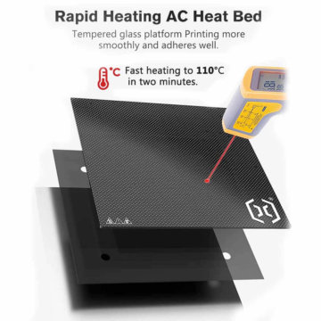Die Druckplatte besteht aus gehärtetem Glas, welches für einen reibungslosen Druck und ausgezeichnete Haftung sorgt. Durch seine hervorragende Wärmeleitfähigkeit kann das AC-Heizbett eine Temperatur von 110 Grad Celsius in nur 2 Minuten erreichen, wobei die maximale Leistung bei 130 Grad Celsius liegt.