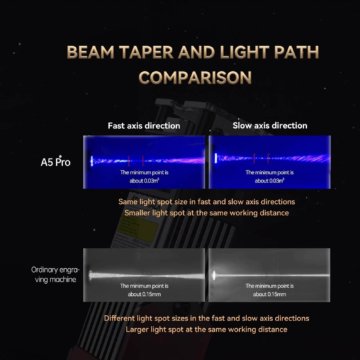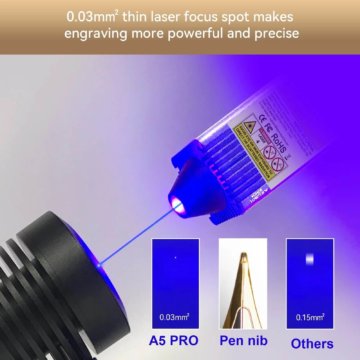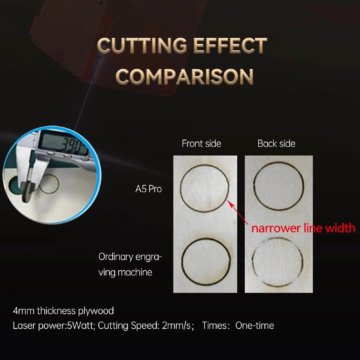 Der Laser des A5 Pro 40W kann problemlos Keramik und glattes Edelstahlmetall direkt gravieren und 12 mm dickes Holz sowie schwarzes Acryl schneiden. Der ultrafeine Laserfokusbereich ist auf 0,23 mm2 reduziert und die Laserleistung beträgt 4,5-5,5 W.