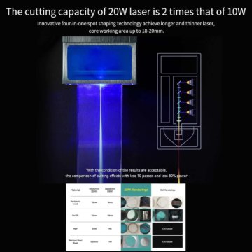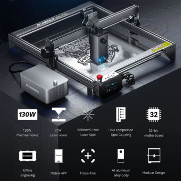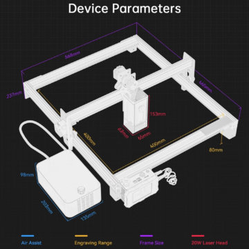 Der Rahmen des ATOMSTACK X20 Pro Lasergravierers und Lasercutters besteht aus einer eloxierten Aluminiumlegierung. Das Gerät wird als Bausatz geliefert, die Montage soll zwischen 20 und 30 Minuten dauern. Besonders interessant ist, dass es sich hier um das erste Gerät handelt, das mit einem 20 W Diodenlaser ausgestattet ist, bei dem die Energie aus vier 6-Watt-Lasern mit Hilfe einer Kopplungstechnologie gebündelt wird. So ist das Gerät in der Lage, bis zu 8 mm dicke schwarze Acrylplatten, bis zu 12 mm dicke Massivholzplatten und 0,05 mm dicke Edelstahlbleche in einem Durchgang zu schneiden. Mit dem Air Assist Kit werden die Schneidekapazität verbessert und die Schnittgenauigkeit und -qualität deutlich optimiert.