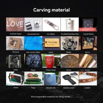 Geeignete Materialien zum Gravieren/SchneidenÜber 40 verschiedene Materialien, u.a. Holz, Bambus, Pappe, lackiertes Metall, 304 Edelstahl, Karton, Kunststoffe, Leder, Glas, Keramik, Textilien, Acryl etc.