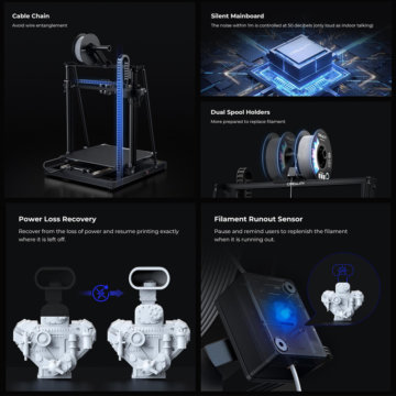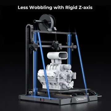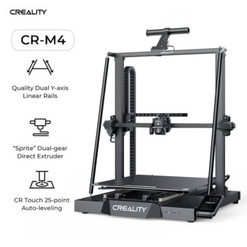 Ausgestattet ist der Creality CR-M4 mit zwei CNC-gefrästen Y-Achsen-Linearschienen, die für eine reibungslose Übertragung sorgen, und mit einer High-Flow-Düse sowie einer Heizpatrone mit einer Leistung von 50 W. Die Schienen werden aus Lagerstahl gefertigt, sind spielfrei, verschleißfest und gegen hohe Belastungen widerstandsfähig. Herstellerangaben zufolge sind diese Schienen deutlich zuverlässiger und langlebiger als Y-Nut-Schienen. Die doppelte Z-Achse bildet zusammen mit zwei Stützstangen ein starres Dreieck, welches den oberen Rahmen stabilisiert. Jede Z-Achse ist mit einem eigenständigen Motor versehen, der für saubere Bewegungen sorgt.